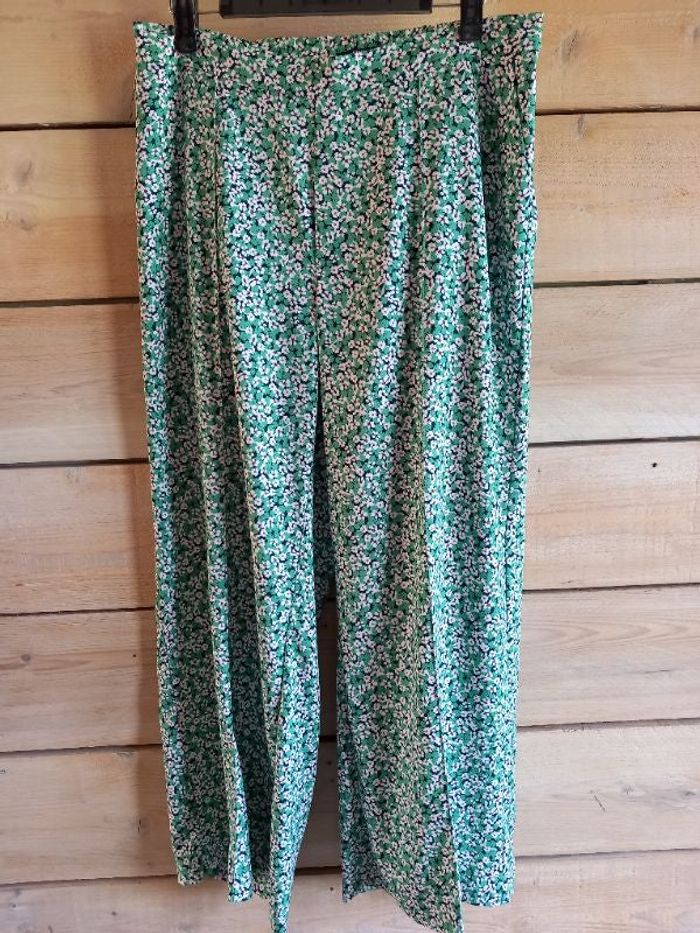 Pantalon large fleuri vert blanc noir et rose Taille élastiquée Polyester A enfiler par la taille Hanches à plat 64 cm Longueur jambes 108 cm T 46 Kiabi