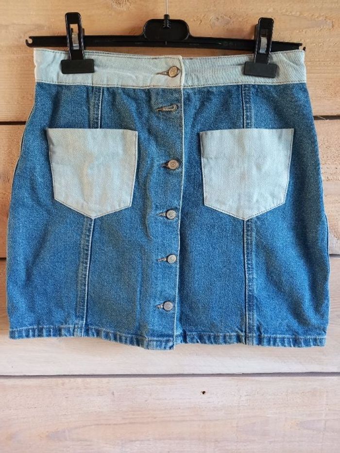 Jupe Jean Bleu clair et bleu Fermeture devant par bouton 2 poches plaquées sur devant Longueur 40 cm Plus d'étiquette T M Pull&Bear