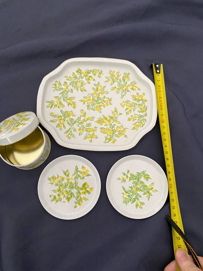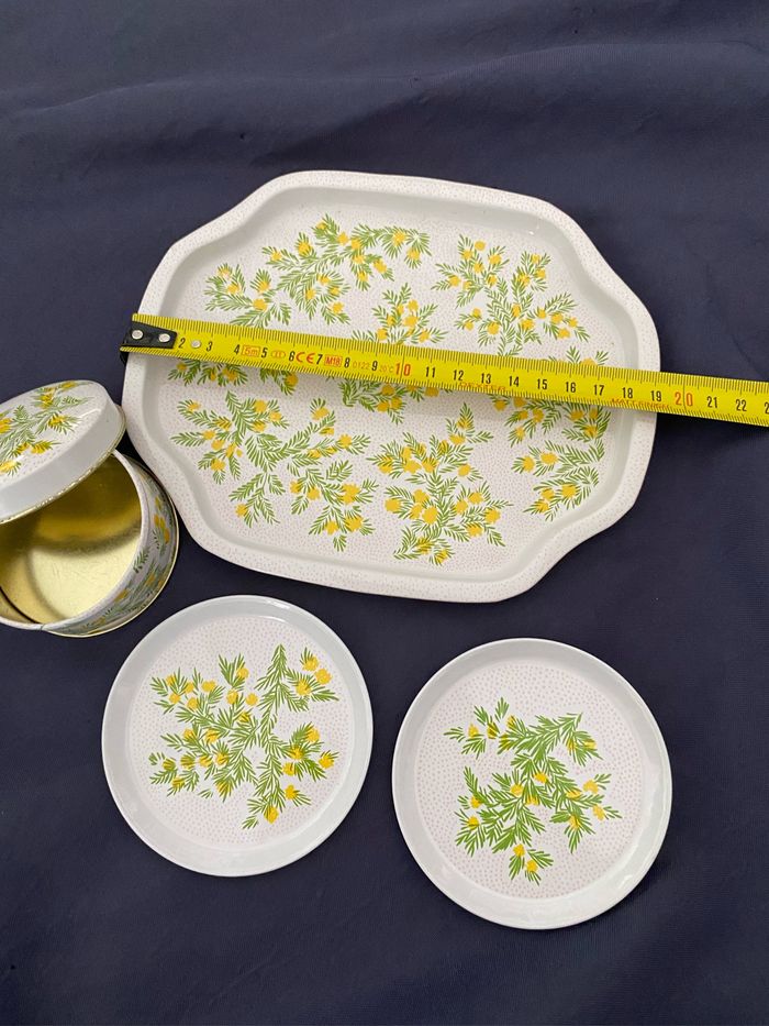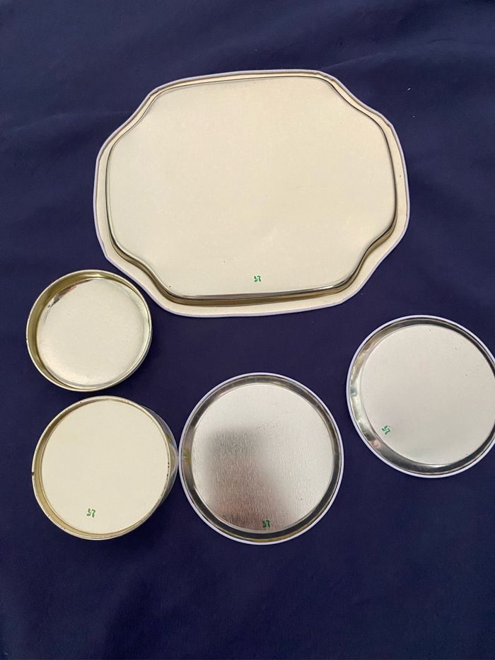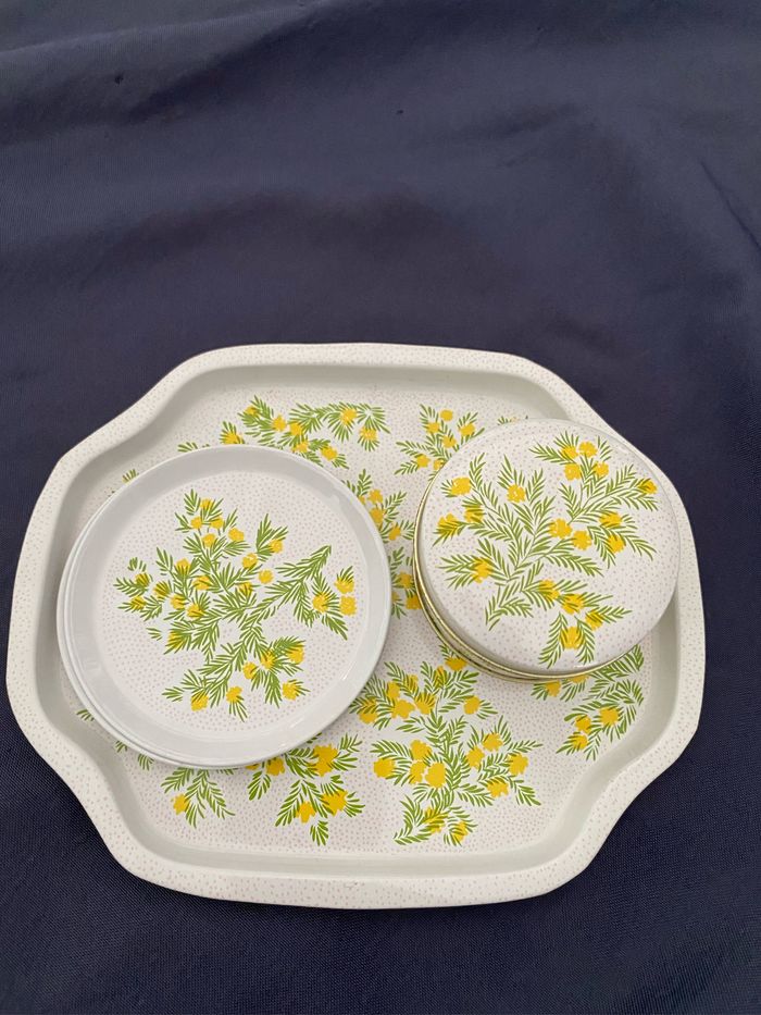 Lot assorti composé de 4 éléments : un petit plateau, une boîte avec couvercle et deux mini soucoupes . Neuf jamais utilisé .