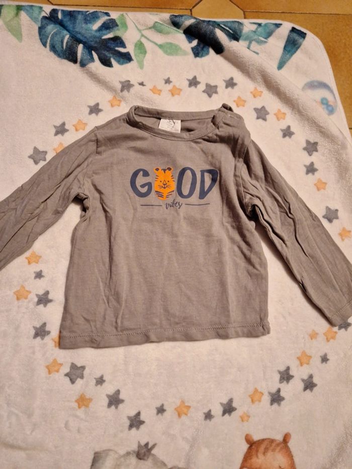 Tee-shirt manches longues Marque Kiabi Taille 12 mois Couleur gris taupe Message Good Vibes Tête de tigre Neuf jamais porté #12mois #12moisgarcon #garcon12mois #pingpong1994_12mois