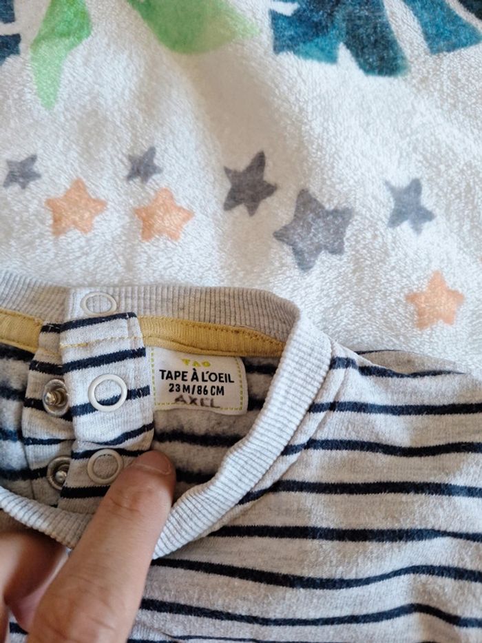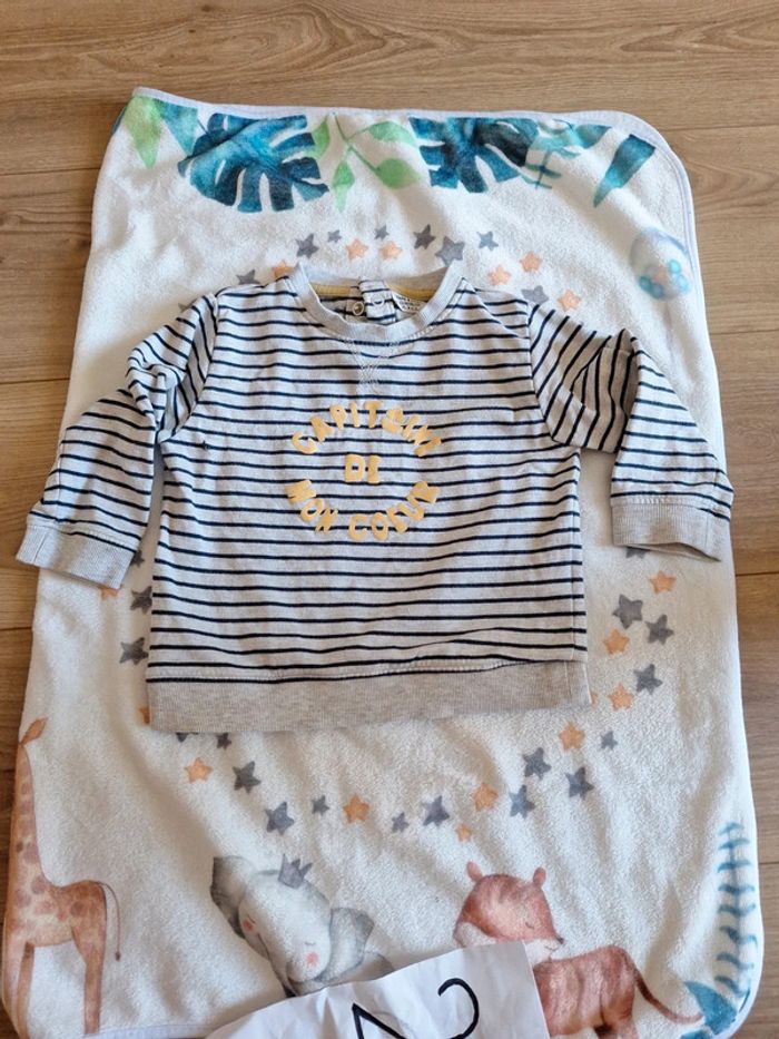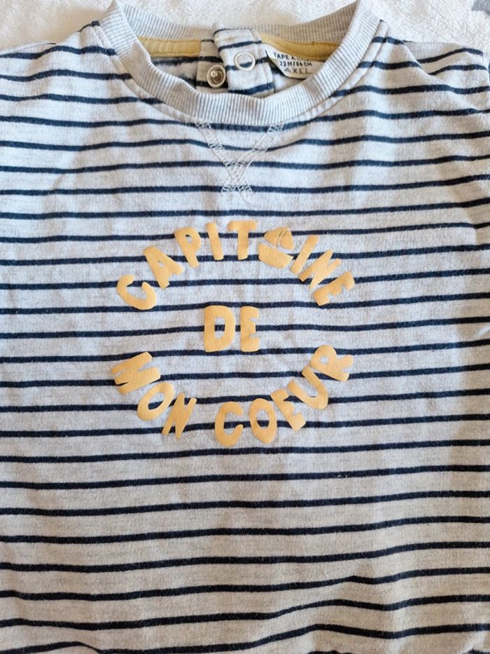Sweat Pull rayé marinière Taille 23 mois Marque Tape à l'œil TAO Couleur blanc et bleu marine Capitaine de mon cœur Bon état mis à part un accroc (voir photo) #24mois #24moisgarcon #garcon24mois #pingpong1994_24mois #pingpong1994_2ans