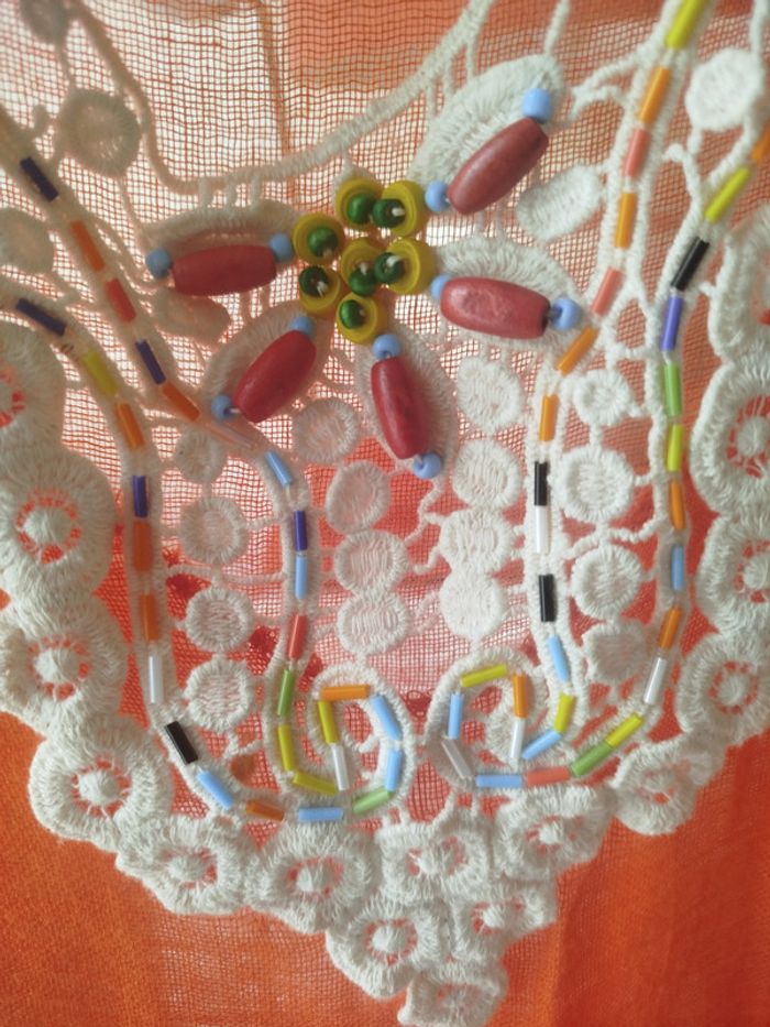 Robe de plage longue Bohème Plastron macramé/Perles de bois Pompons perles sur les cotés et le bas Coton lin , légère T unique ira jusqu'à un 46 PAS DE VINTED GO