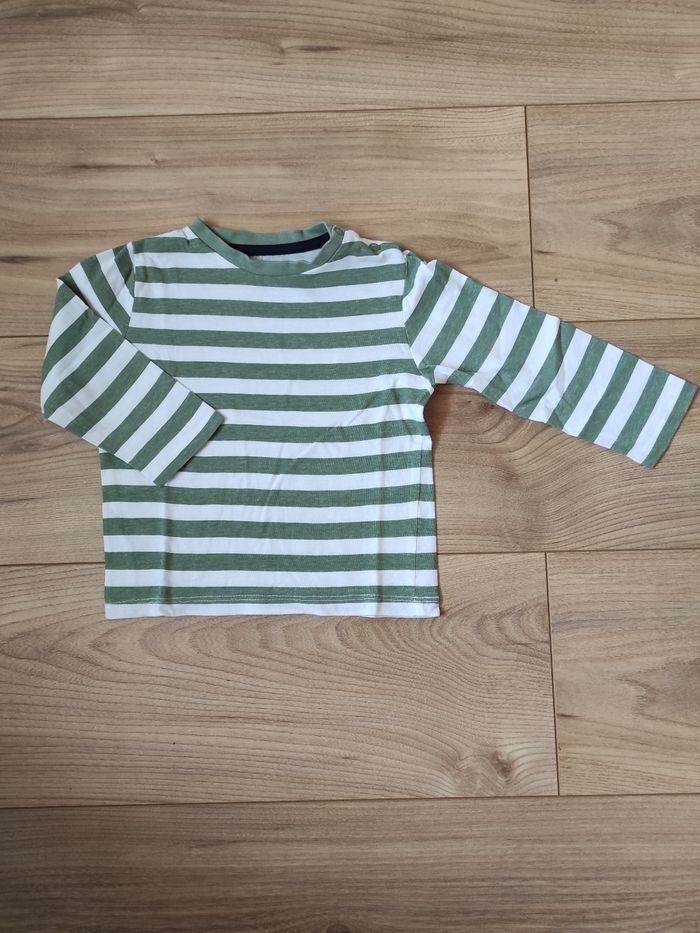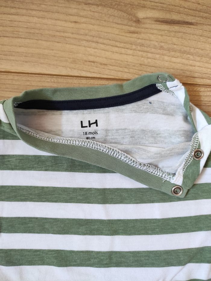 T-shirt manches longues 18 mois La Halle . Rayé vert/blanc, ouverture par pressions au niveau de l'épaule gauche.