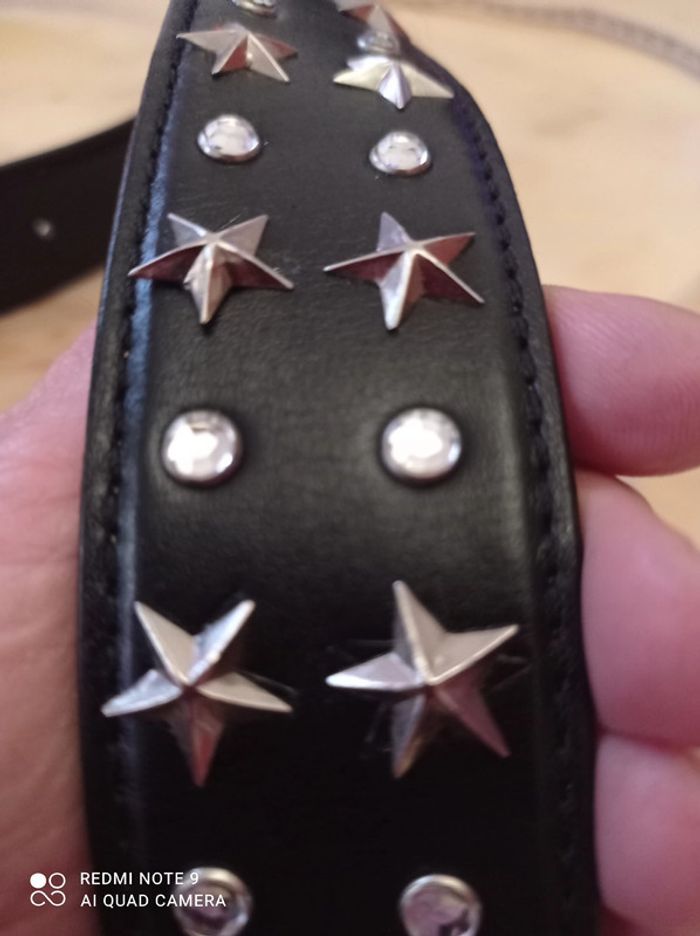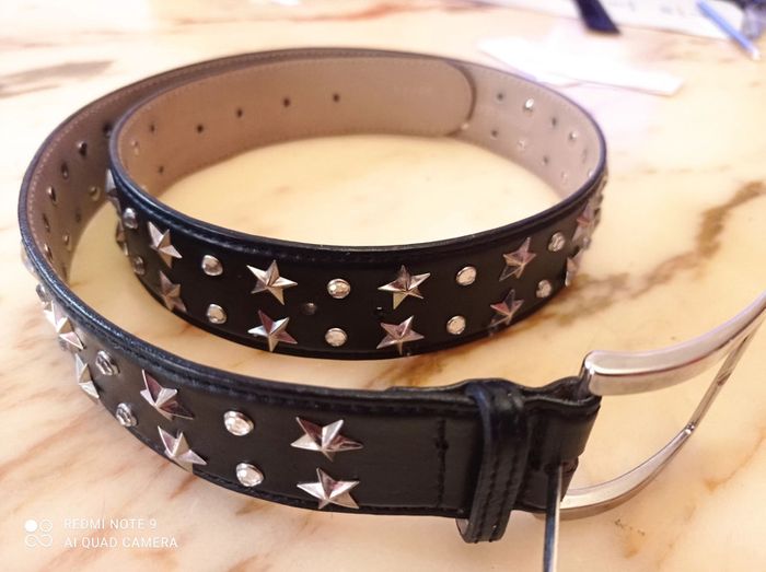 Ceinture neuve Francogiarri Tout cuir 90/36 Longueur 97 sans boucle(6cm) Largeur 4cm Étoiles et strass,aucun manquant Jamais utilisée (voir trous) Réductions jusqu'à 30 pour cent pour les achats en lots