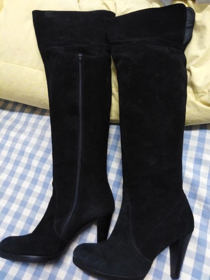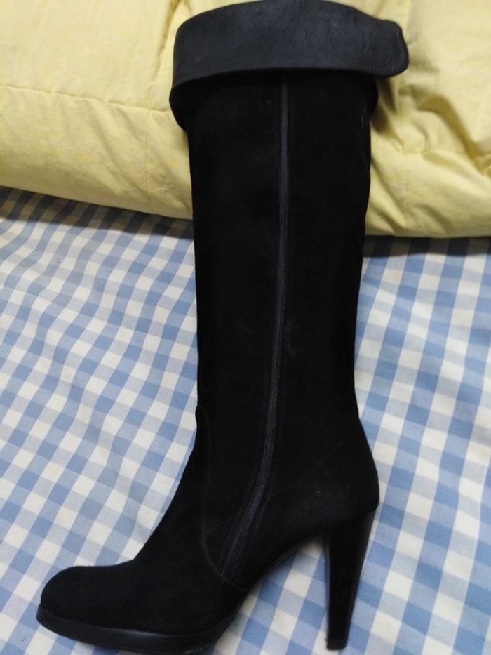 Cuissardes nubuck/cuir. Fabrication espagnole Talon bois 9cm sur un compensé de 1cm Peuvent etre portées aussi avec un rabat . Zip sur 41cm hyper faciles à enfiler Hauteur tige sans talon 52 cm Parfair état SAUF petites ecorchures à l'arriere des talons (derniere photo). Rien de méchant Valeur 189€ Reductions jusqu'à 30 %pour les achats en lots