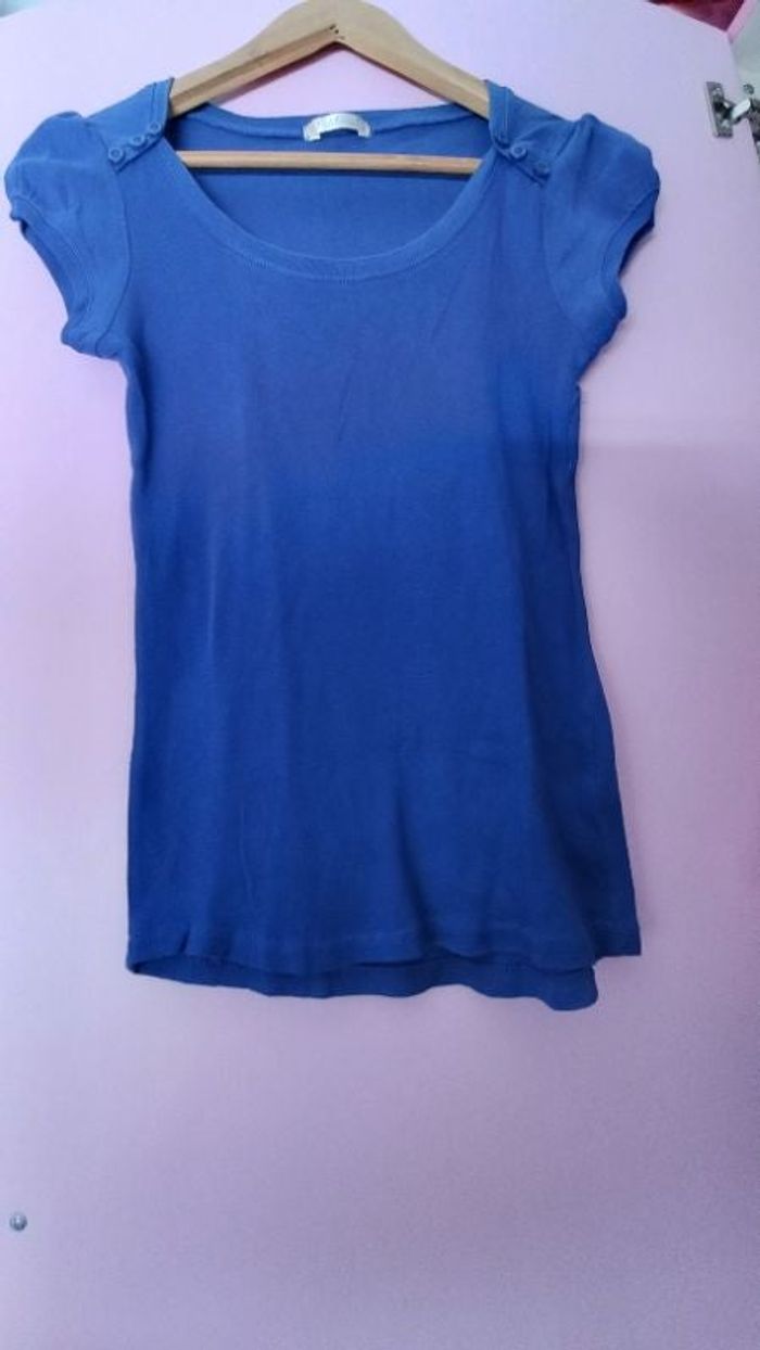 T-shirt fille manches courtes, taille S. Couleur bleue, le col est ample. Largeur des épaules :33 cms. Longueur:59 cms. Étiquette de composition coupée. Bon état.