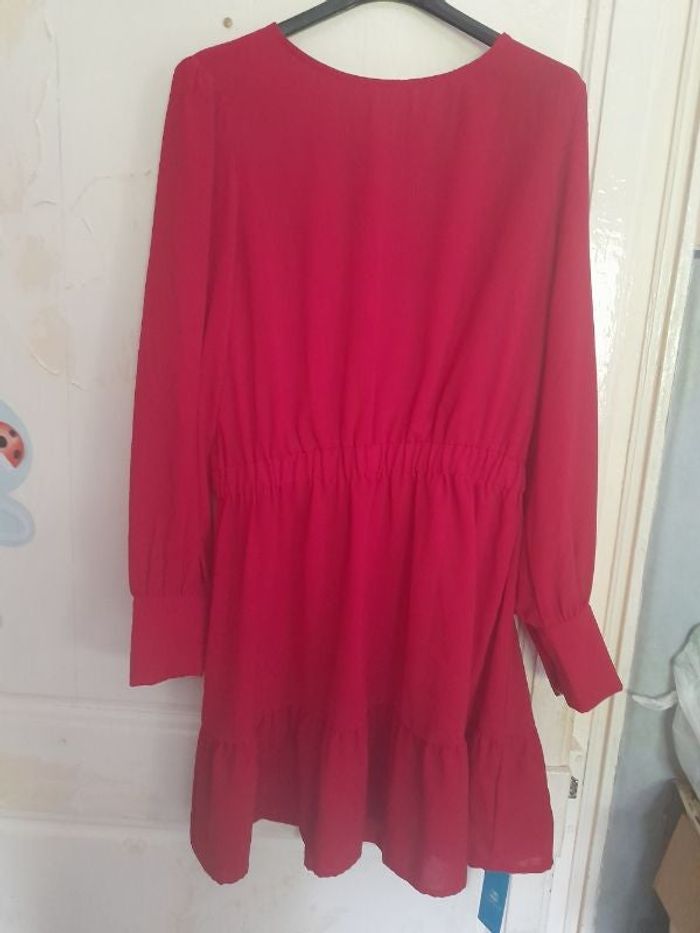 Robe rouge, neuve avec étiquette, taille L. Elle présente un bouton au dos pour fermer l'encolure ainsi que 2 boutons aux poignets. Elle présente également une ceinture à la taille ainsi qu'un volant dans le bas de la robe. largeur épaules : 38 cm largeur aisselle à aisselle : 54 cm hauteur : 97 cm composition : 96% polyester et 4% élasthanne N'hésitez pas à regarder mes autres ventes pour profiter des réductions sur les frais de port !