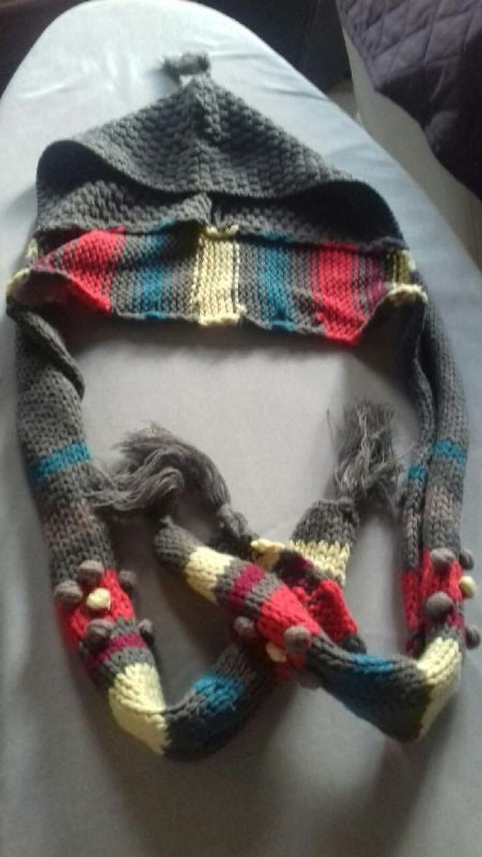L’ensemble est de couleur kaki avec des bandes jaunes, rouges et bleu canard. Il est comme neuf. Le bonnet et l’écharpe sont tricotés en mailles différentes. Le bonnet présente un pompon à son sommet, l’écharpe présente 2 séries de 6 pompons cousus ainsi que 2 pompons identiques au bonnet de chaque côté. Le gant droit présente également 6 pompons cousus. Hauteur du bonnet : 24 cm Longueur de chaque côté d’écharpe : 80 cm Longueur totale d’un gant : 32 cm Longueur d’un majeur : 7 cm Composition : 100% acrylique N'hésitez pas à regarder mes autres ventes pour profiter des réductions sur mon dressing !