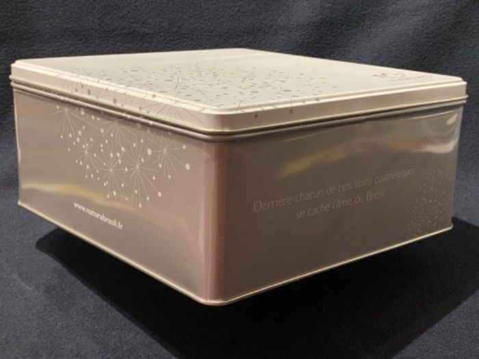 Boîte en métal Natura Brasil couleur gris, couvercle blanche Décoré Dimensions: 23 x 22 x 10cm Marque: Natura Brasil #naturabrasil #boitemetal #loisirscreatifs #scrapbooking #rangement