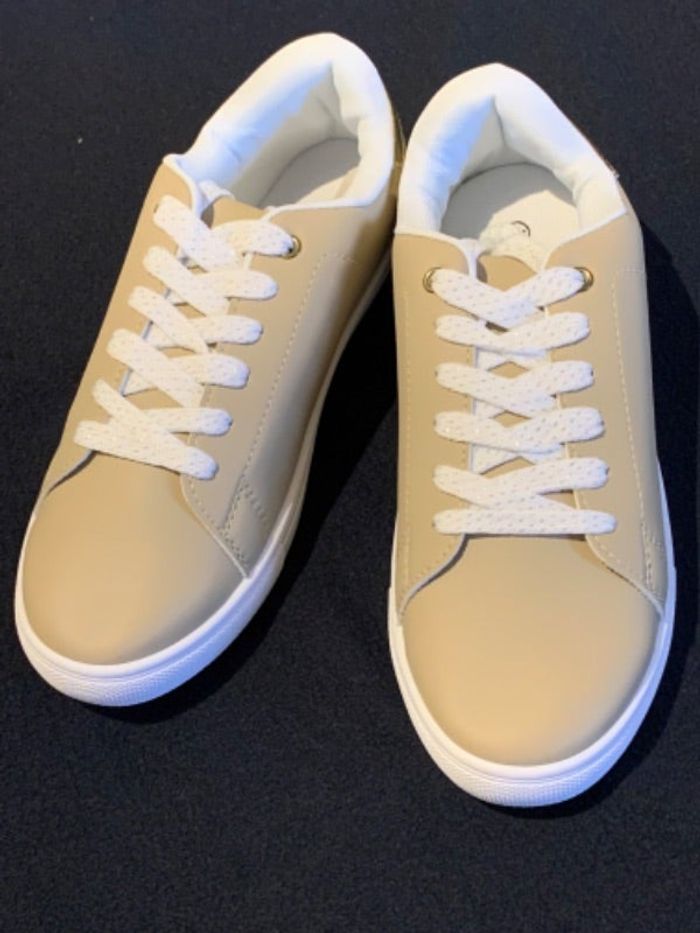 Sneakers, baskets femme Pointure 41, couleur beige/doré/blanc Lacets blancs et fil argenté Neuf sans utilisation #sneakers #tennisfemme #basketsfemme #p41 #tennis41
