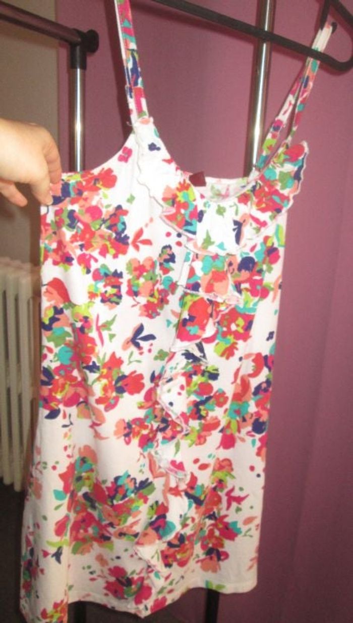 Robe à fleurs Bretelles réglables Taille 38/40 Volants sur la robe au niveau de la poitrine et de haut en bas sur le devant de la robe 100% coton
