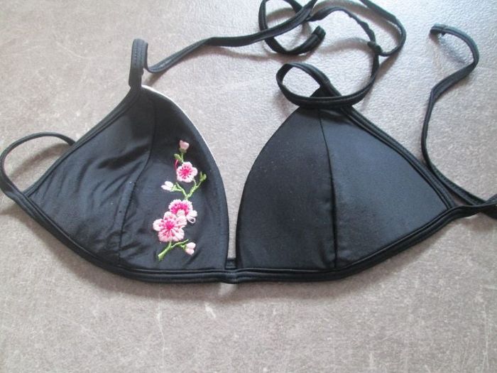Haut de maillot de bain avec fleur brodée Maillot de bain en triangle A nouer dans le dos et sur la nuque Légèrement rembourré Taille 36