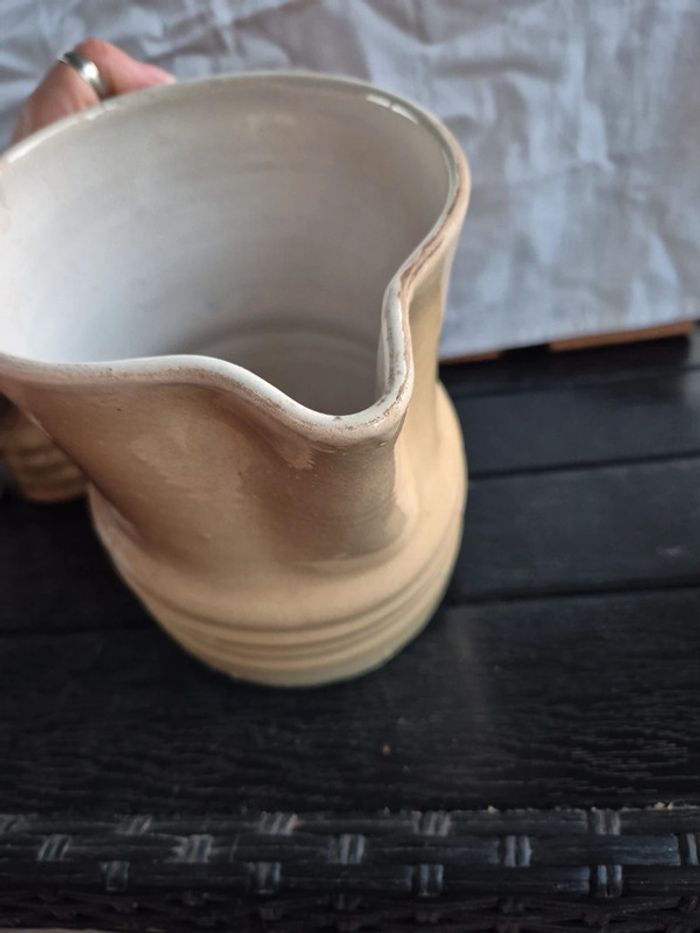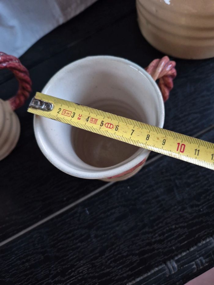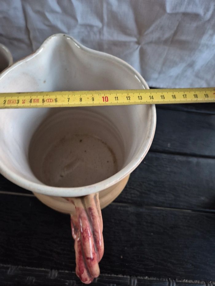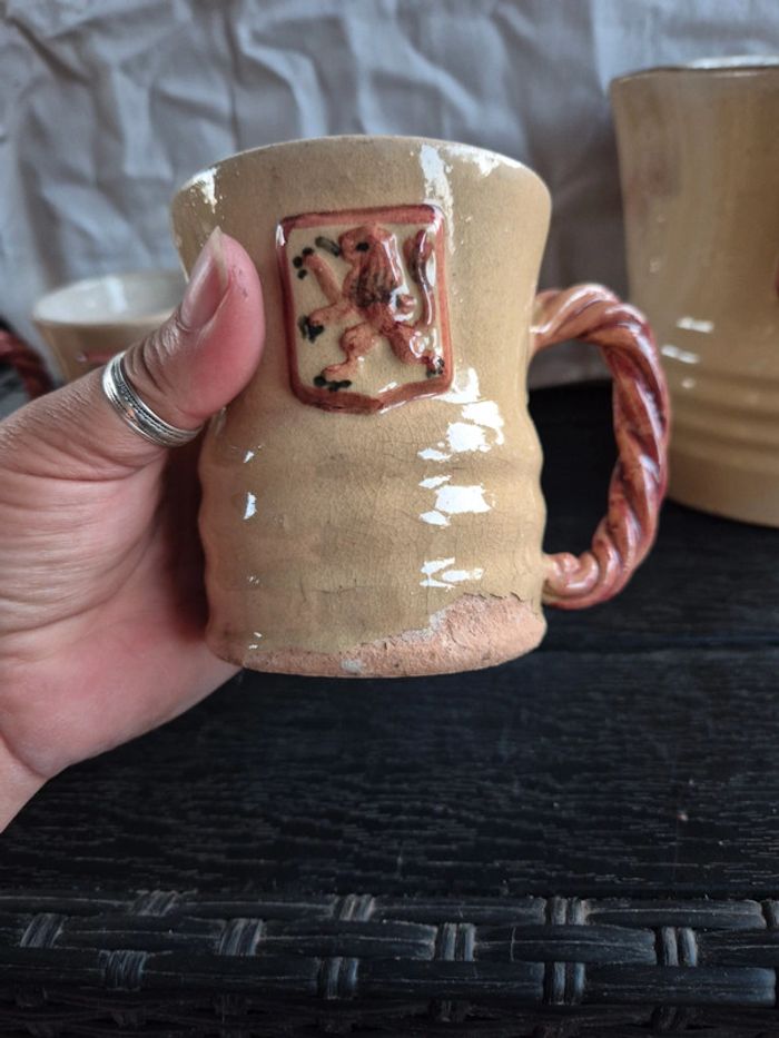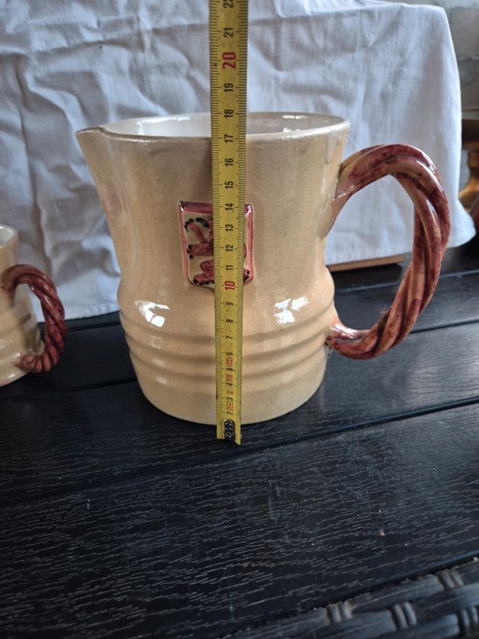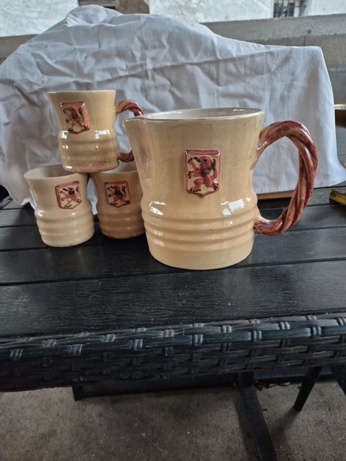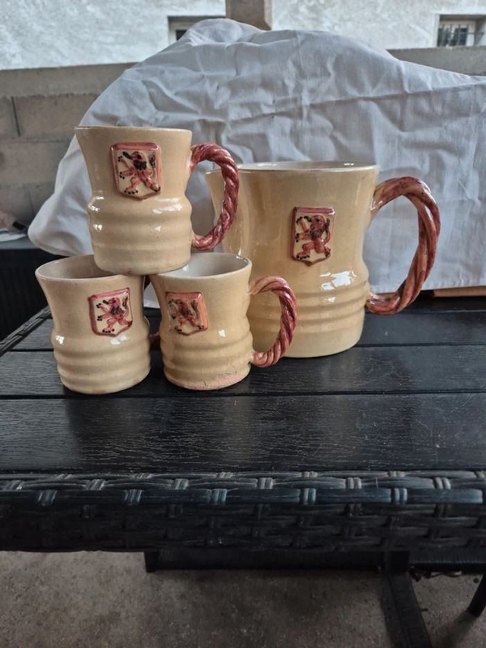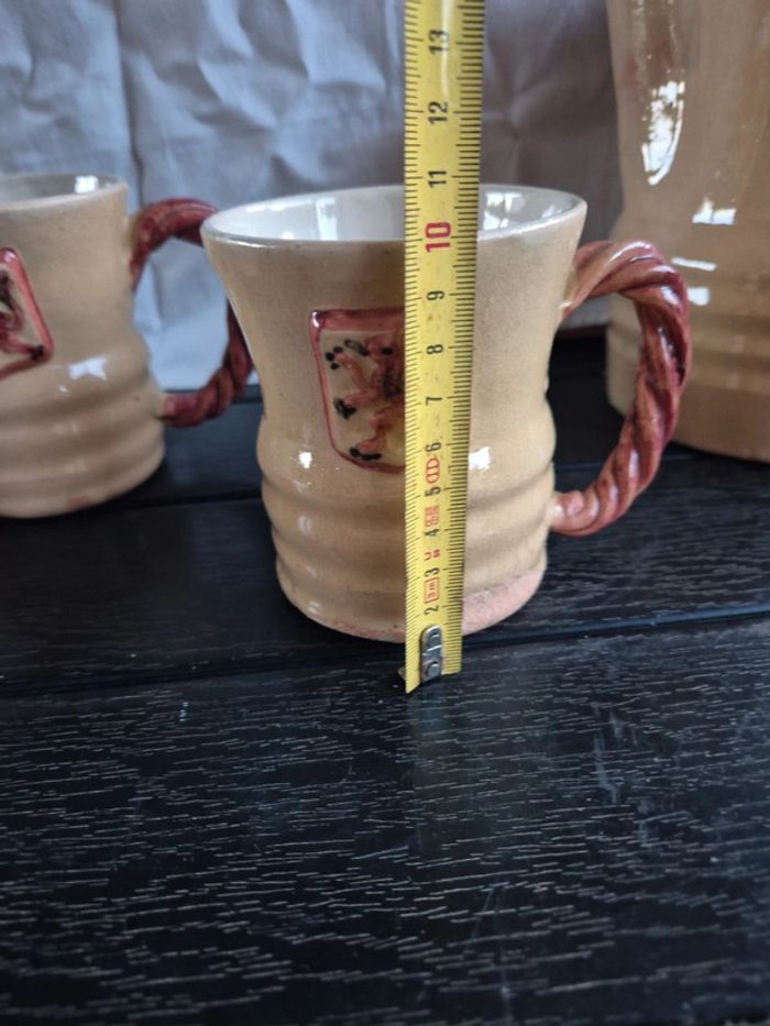 ⬇️mes autres annonces d'article de maison, décoration👉 #cg89déco un broc ou pichet avec 3 chopes assorties. une anses de couleur rosé et tressé, un blason ou armoirie qui ressemble à un lion. attention une chope "perd" son vernis sur le fond (voir photo). le reste est en très bon état #broc #pichet #chope #armoirie #carafe