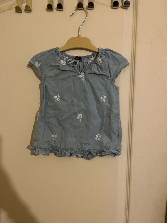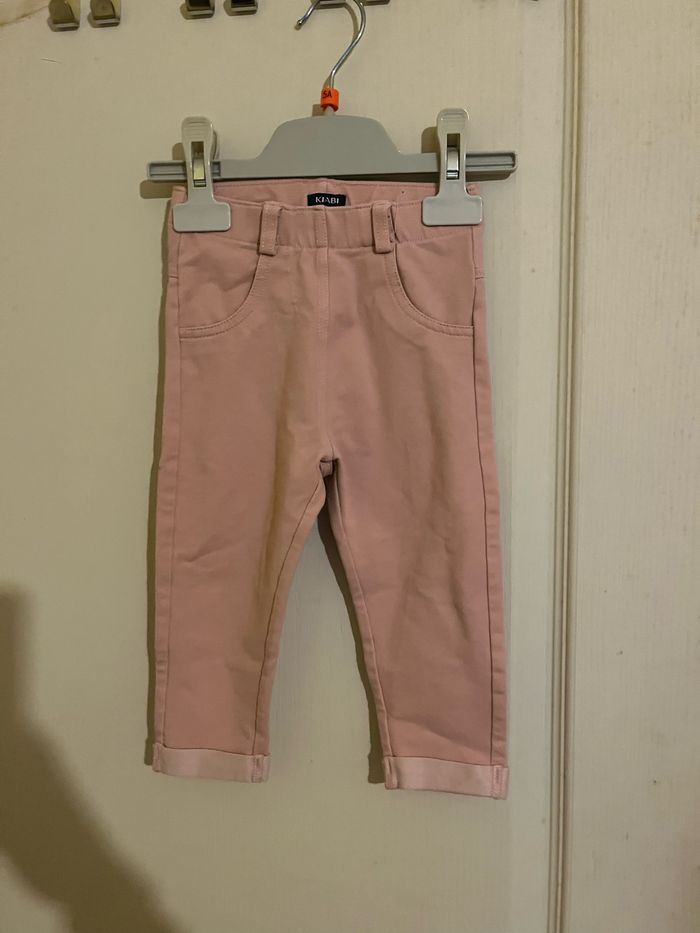 Vends ensemble pantalon rose + blouse bleu à motifs blanc en très bon état. Taille 18mois