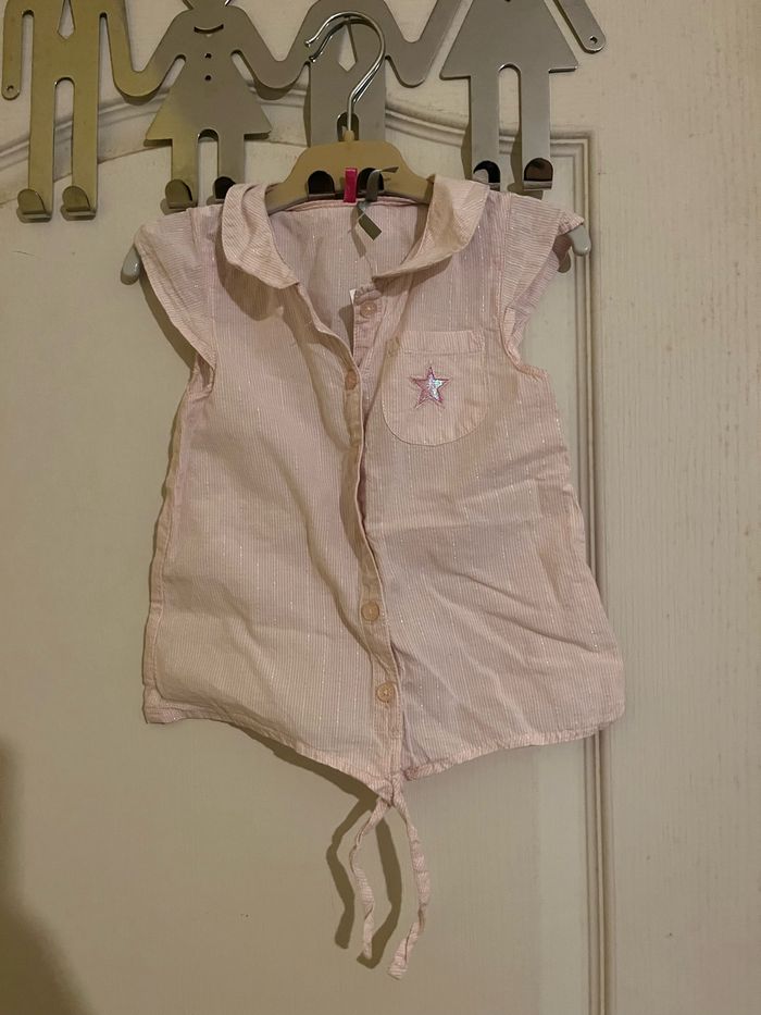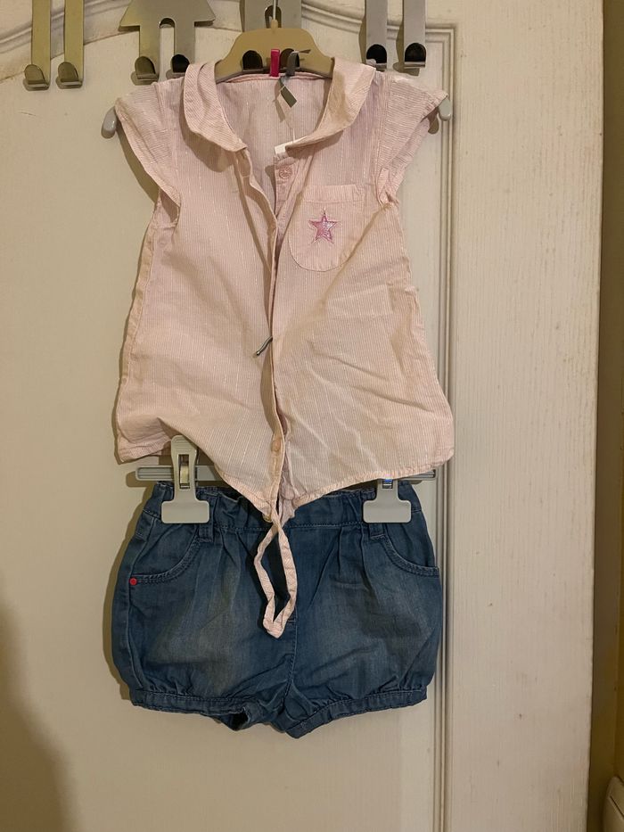 Vends ensemble short bleu + chemise sans manche rayée rose en très bon état. Taille 18mois