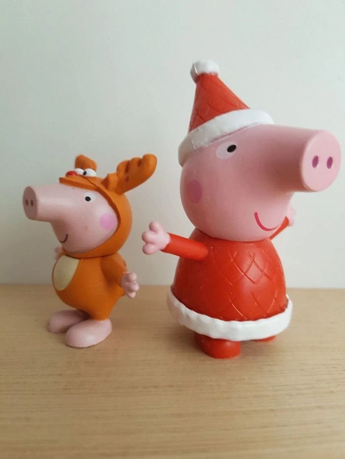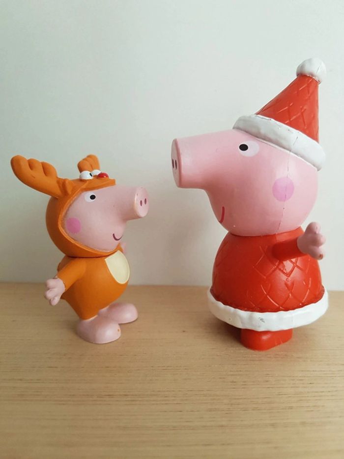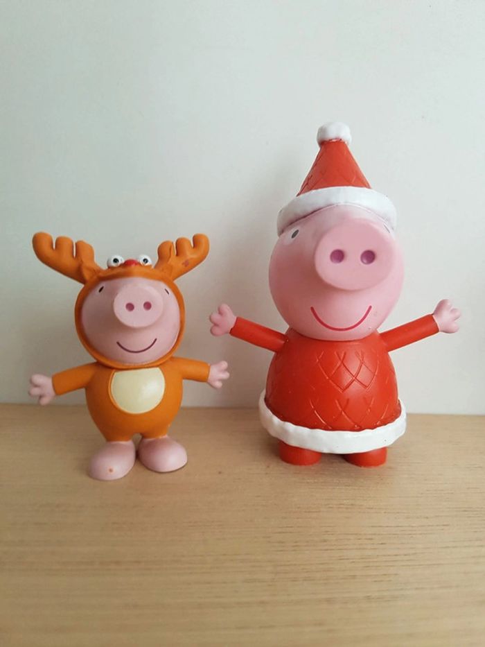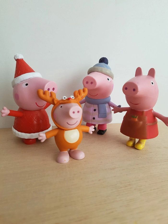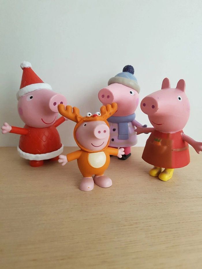 Lot de 4 figurines de l'univers de Peppa Pig avec la petite fille cochon et son petit frère 2 thèmes différents : jardinage, déguisement / Noël. Marque ABD/eOne ▪︎ Peppa Pig avec bottes jaunes et tablier de jardinage, hauteur 7 cm ▪︎ Georges en costume de renne pour le carnaval , hauteur 5 cm ▪︎ Peppa déguisée en père-noël avec bonnet rouge, hauteur 8 cm ▪︎ Peppa habillée pour l'hiver avec bonnet, écharpe, gants, et patin à glace