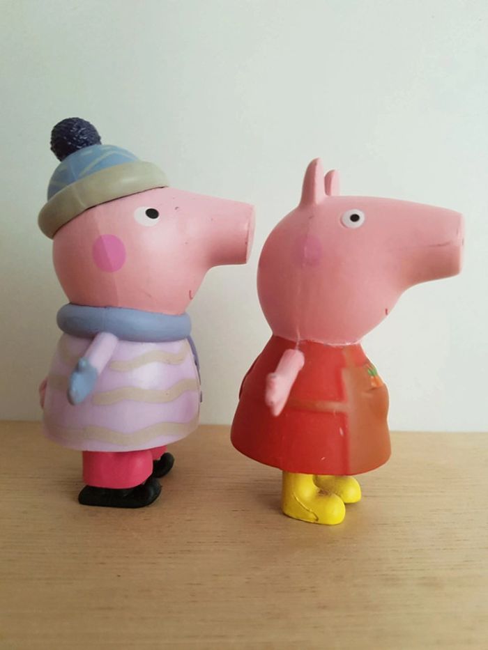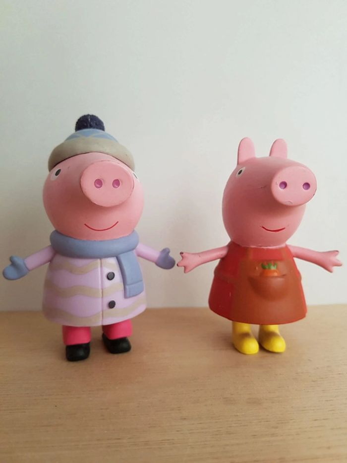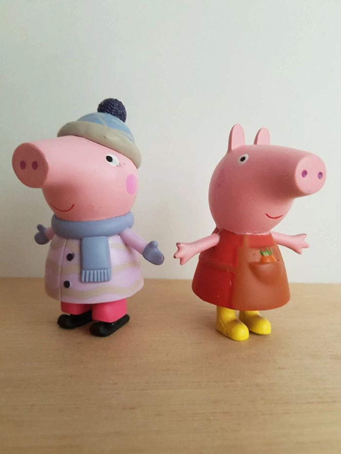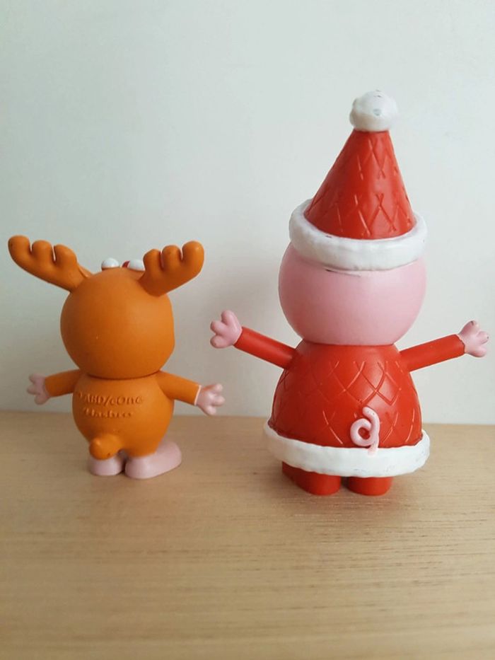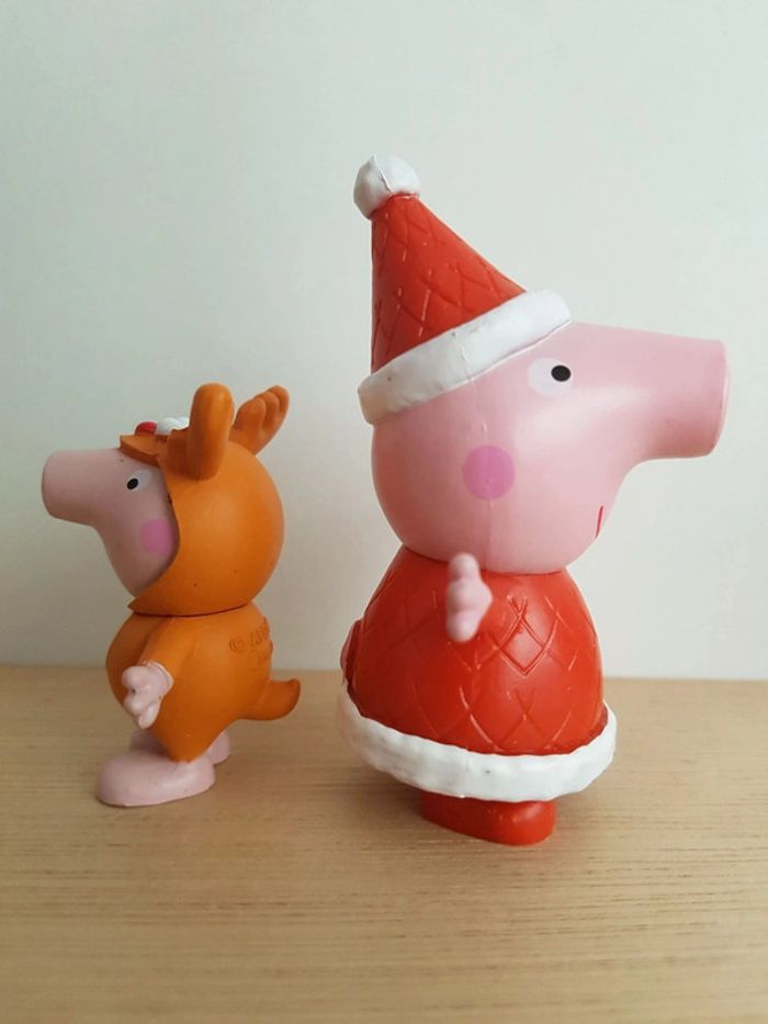 Lot de 4 figurines de l'univers de Peppa Pig avec la petite fille cochon et son petit frère 2 thèmes différents : jardinage, déguisement / Noël. Marque ABD/eOne ▪︎ Peppa Pig avec bottes jaunes et tablier de jardinage, hauteur 7 cm ▪︎ Georges en costume de renne pour le carnaval , hauteur 5 cm ▪︎ Peppa déguisée en père-noël avec bonnet rouge, hauteur 8 cm ▪︎ Peppa habillée pour l'hiver avec bonnet, écharpe, gants, et patin à glace