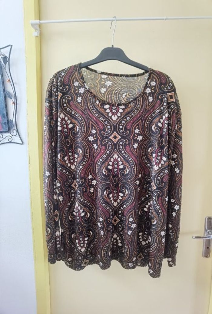 Souvent porté Taille XL 44-46 Matière élastique Couleur marron à motifs Pas de défaut constaté #carolinevêtementsXL #carolinehaut #pullfemme