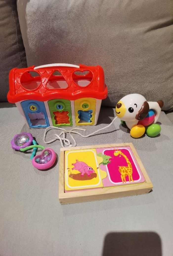Ensemble de jeux pour enfants/bébés - jeux de formes (très bon état, pièces OK et toutes presentes) - chien à tirer sur roulette avec ventre balle (très bon état) - hochet (très bon état) - jeu puzzle animaux (très bon état, pièces OK et toutes présentes, en bois) #jeuxenfants