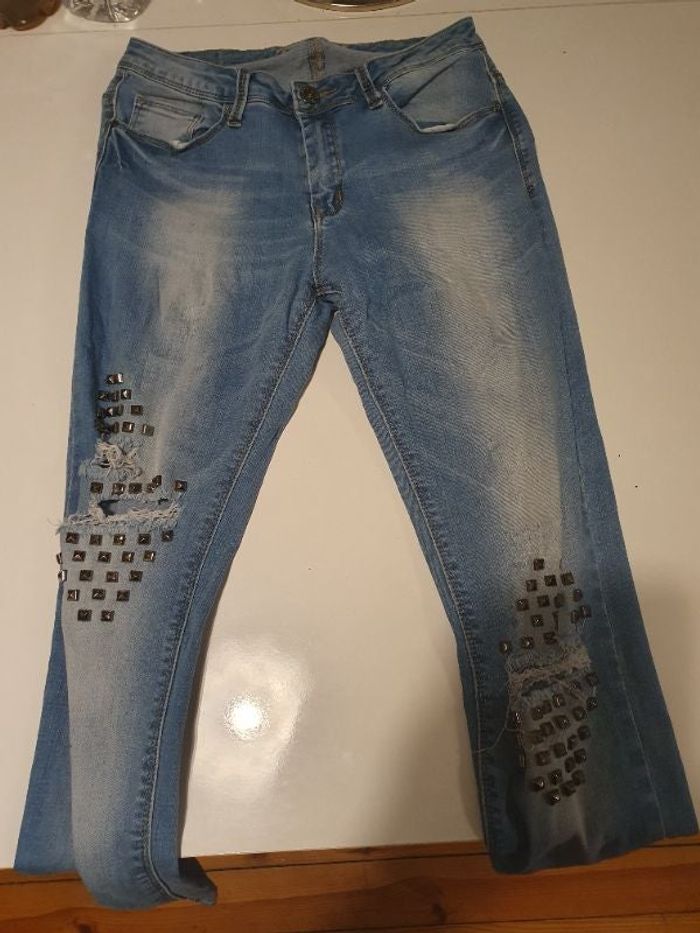 Jean bleu avec bouton et fermeture éclair avec détail de strass et trou en taille xs/s bon état