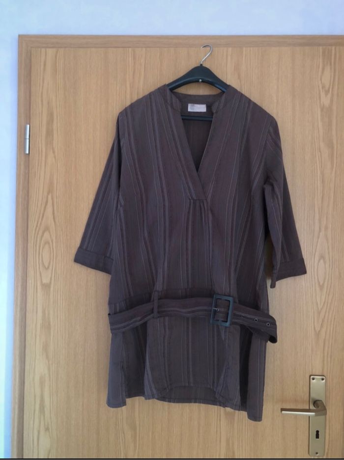 Manches 3/4. Ceinture amovible. Dimensions : longueur 83 cm / largeur entre aisselles 55 cm / largeur épaules 39 cm.