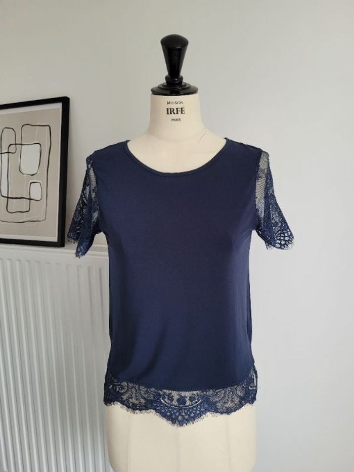 Joli haut taille 34, à nouer dans le dos, bleu marine Excellent état Longueur dans le dos : 56cm Largeur épaule à épaule : environ 33cm Longueur de manche : 18cm #paulineg61xxs