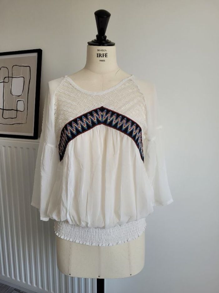 Dressing Pauline Haut léger blanc transparent taille M Excellent état, peu porté, aucune tâche Longueur dans le dos : 62cm mais effet retroussé avec l'élastique Largeur épaule à épaule : environ 33cm Longueur de manche : environ 40cm #paulineg61m