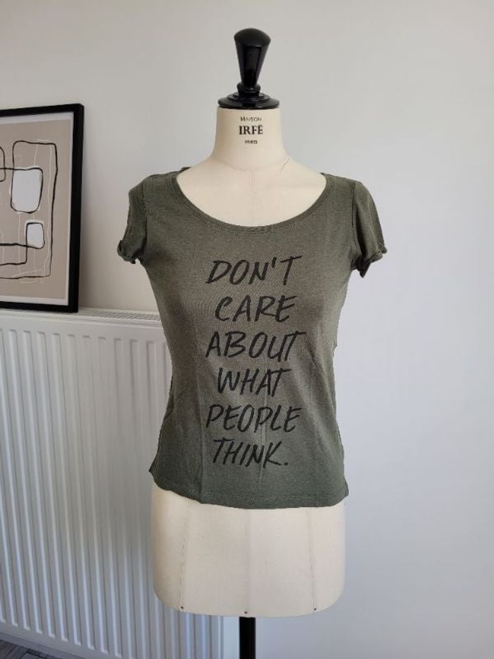 Dressing Pauline Tee-shirt kaki et noir, taille XS Très bon état, ni trous ni tâches Longueur dans le dos : 54cm Largeur épaule à épaule : environ 35cm #paulineg61xs
