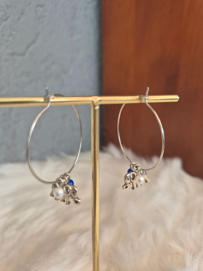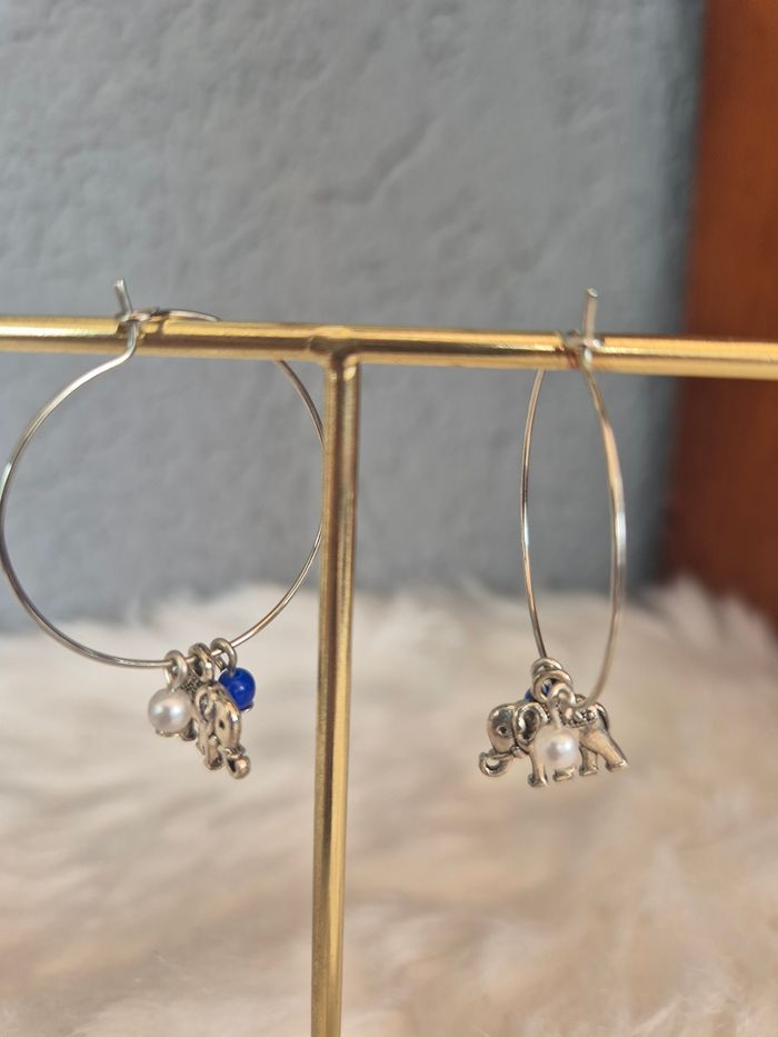 Ces élégantes boucles d'oreilles créoles mettent en valeur des perles blanches et bleues. Leur design est sublimé par de délicates breloques en forme d'éléphants argentée. Avec une longueur idéale de 4 cm, elles habillent le lobe de l'oreille avec finesse. Ces bijoux apportent une touche de sophistication et d'originalité à toute tenue. Un accessoire parfait pour ajouter une note d'élégance discrète au quotidien.