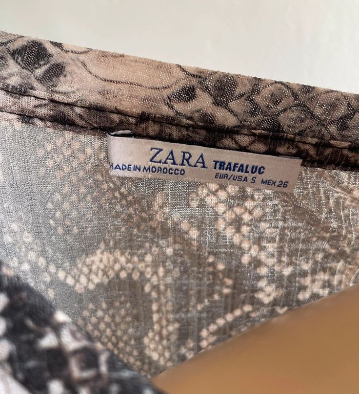 Superbe top peplum Zara Trafaluc avec un motif serpent tendance. Idéal pour un look chic et décontracté. Manches courtes et coupe flatteuse. * Marque : Zara Trafaluc * Taille : S (EUR S / USA S / MEX 26) * Couleur : Tons de marron/beige/noir (imprimé serpent) * État : Excellent état * Fabriqué en : Maroc 🇲🇦 Parfait avec un jean pour le quotidien ou une jupe pour une sortie !