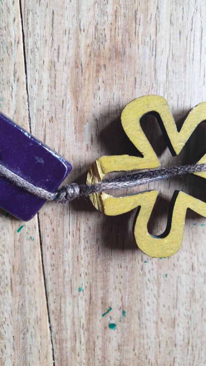Bijou fantaisie collier cordelette bois et céramique. Une fleur en bois est abîmée visible sur la photo de detail