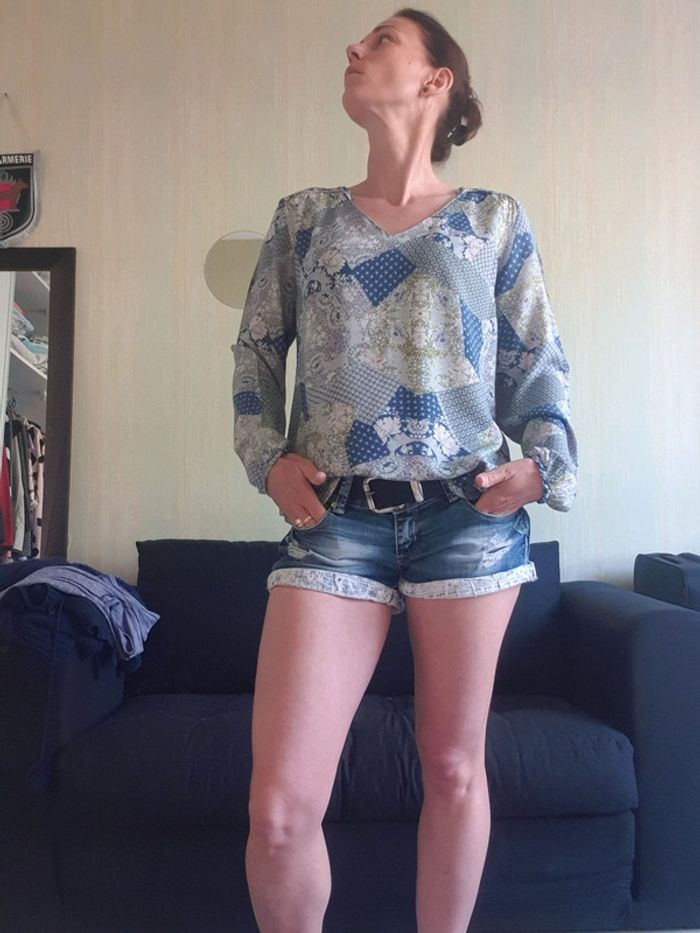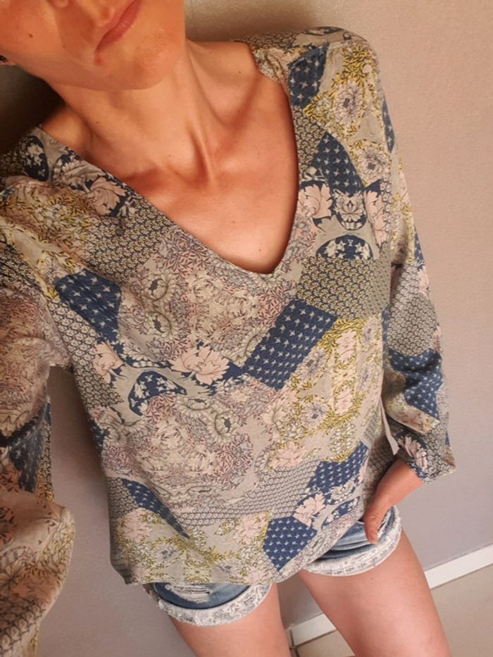 Haut femme en tissu fluide hyper léger et agréable à porter Style un peu bohème Manches longues Taille 36 CAMAÏEU Ton dominant bleu