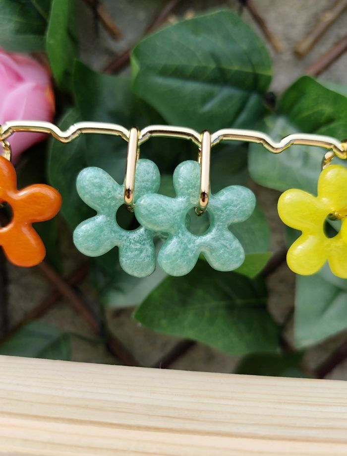 Pampille fleur en résine Fait main Modèle unique Ce pampilles sont fabriquées à la main en résine permettant une forte résistance et une grande durabilité Les pampilles peuvent être vendus séparément des boucles d'oreilles. Dimensions : 3.2 cm environ Les boucles d'oreilles sont en acier inoxydable doré Dimensions : 1.6 cm
