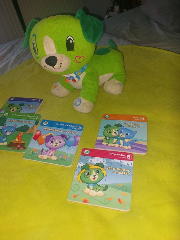 Peluche interactive raconte des histoires avec 5 livres histoires cartonnés. Âge recommandés de 2 à 5 ans