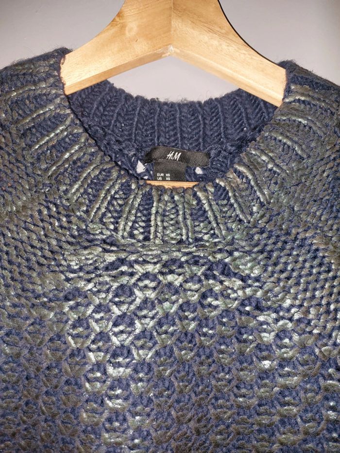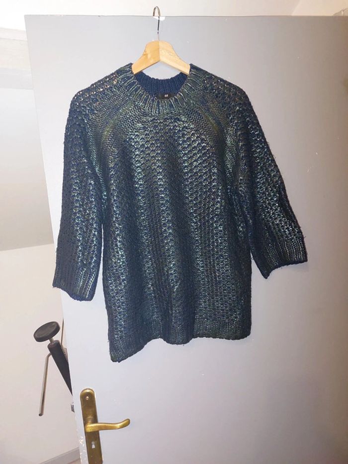 Magnifique pull overside en laine bleu marine enduit d'un vert irisé très belle effet très original