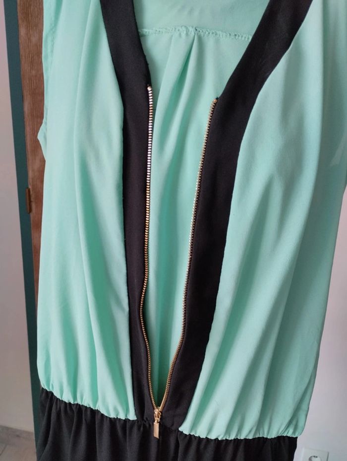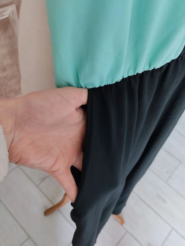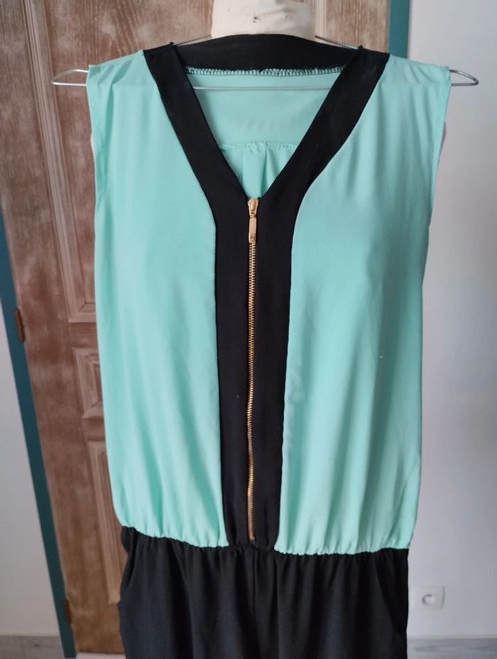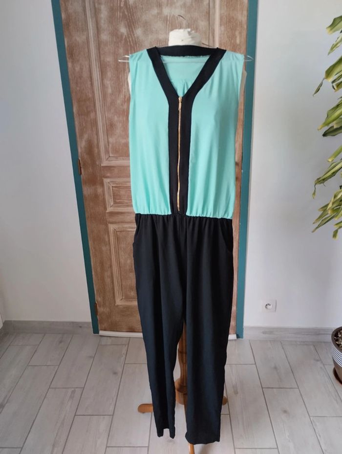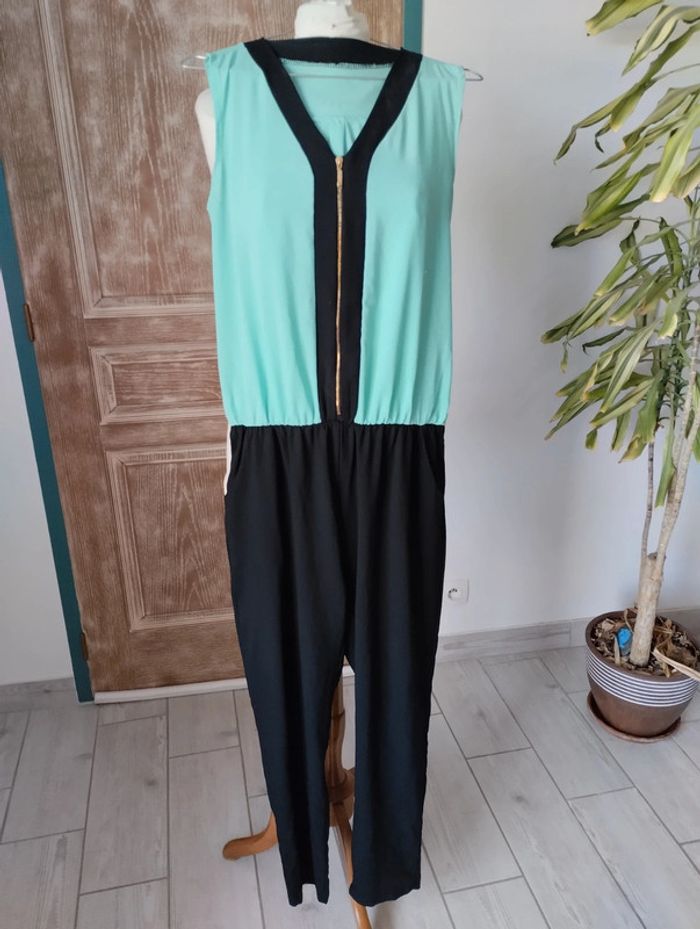 Superbe combinaison Sans marque Taille 38 Deux poches Tissu fluide Haut vert d'eau avec fermeture dorée Bas noir, élastique à la taille #combinaison #taille38 #vetementsfemme