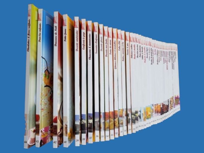 Collection de 47 livres de pâtisserie éditée en 2011 et 2012 par Femme Actuelle. La collection s'appelle : "Pâtisserie et Desserts Gourmands" A l'origine, ces livres étaient vendus en kiosque et en librairie au prix de 8,99 euros l'unité. Ils paraissaient tous les 15 jours. A chaque numéro, vous découvrez un livre sur une thématique de pâtisserie (cake, madeleine, chocolat, tartes..) Chaque livre fait 80 pages et présente 38 recettes, sur un thème précis. Format : 18 cm x 26 cm Tous les livres sont comme neufs, ils n'ont jamais servi. Chaque livre comporte 38 recettes, toutes joliment illustrées, dont certaines sont détaillées en pas à pas sur une double page. Le papier est glacé, les recettes sont clairement expliquées, la présentation générale est très agréable. La couverture, rigide, est également glacée. C’est une très jolie collection de livres de pâtisserie. Je vends uniquement la collection complète du numéro 1 au numéro 47.