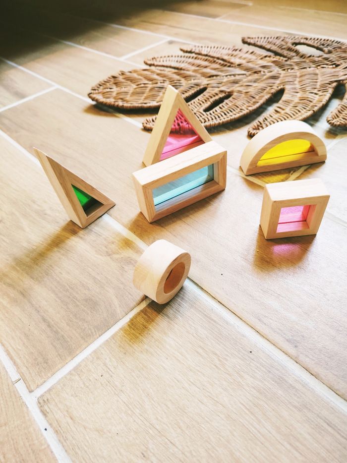 ▶️Construire, empiler, trier, comparer, mélanger les couleurs mais aussi développer l' eveil sensoriel en mettant les formes à la lumière cela projette les couleurs dans la pièce.