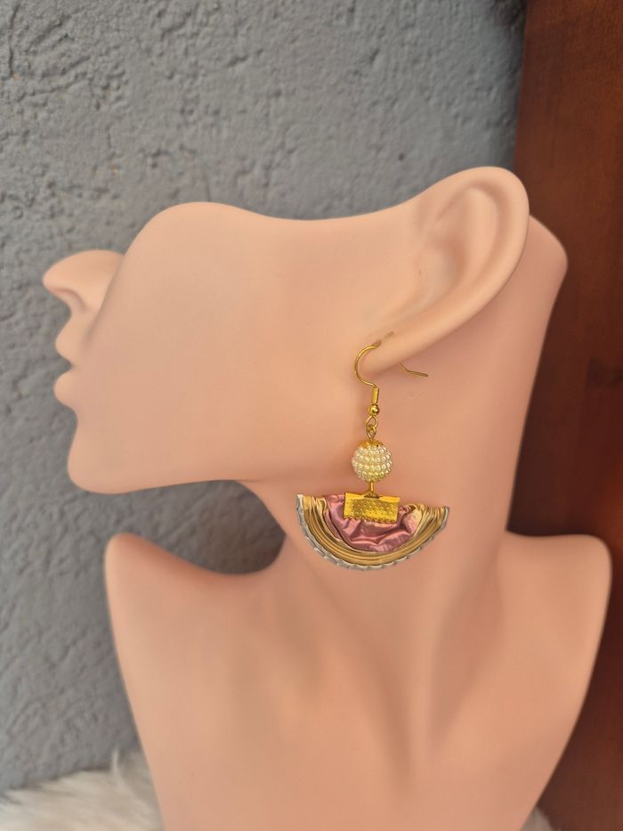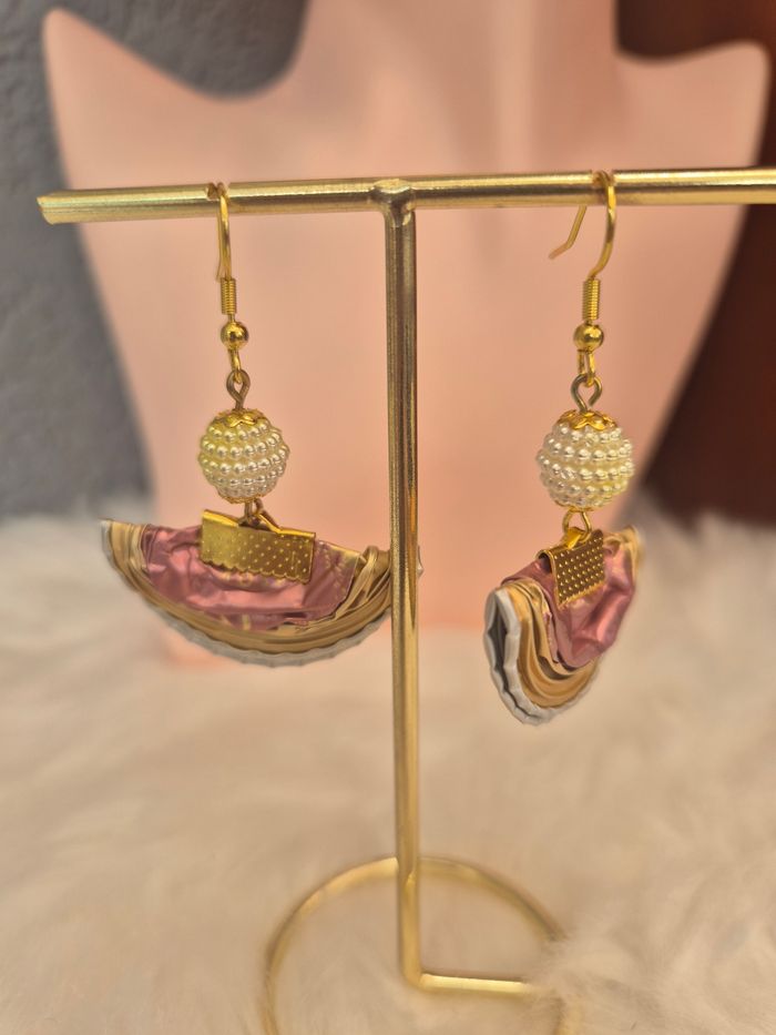 Boucles d’oreilles capsules nespresso, rose et doré. Perles blanche et jaune Crochets en métal dorés Longueur 5,5 cm