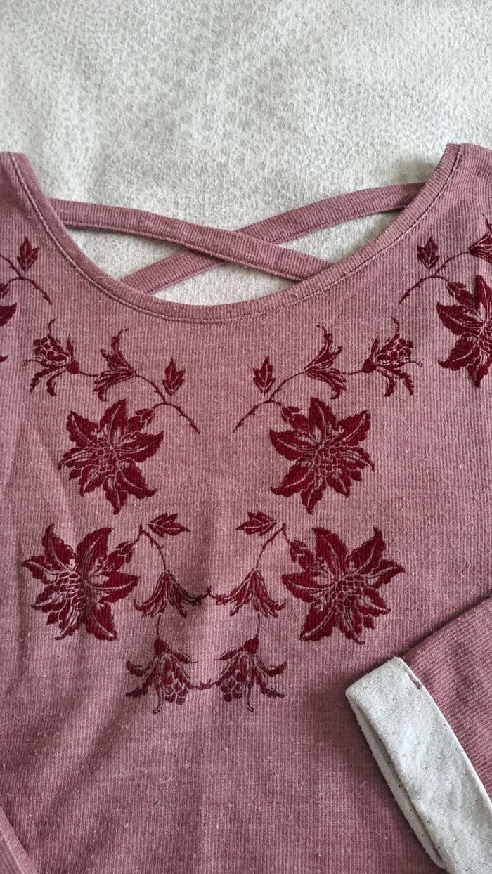 Décolleté dans le dos Plus long à l'arrière qu'à l'avant Motif fleurs avec aspect velours tout doux Quelques bouloches