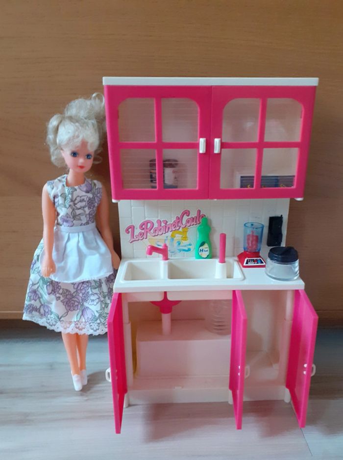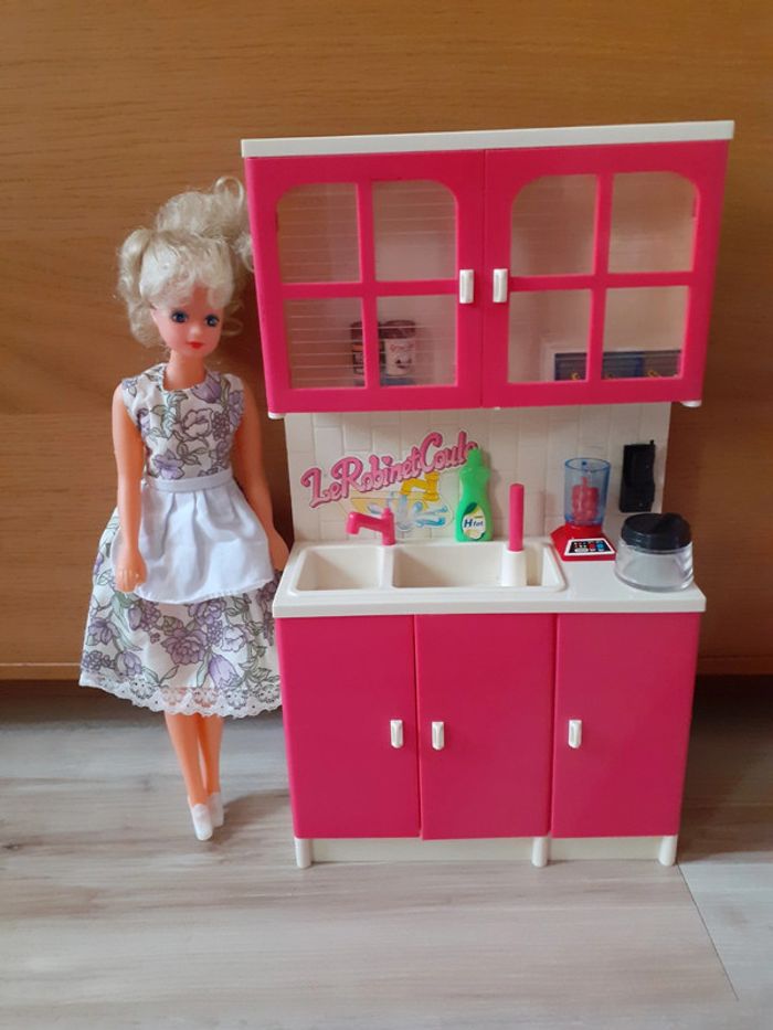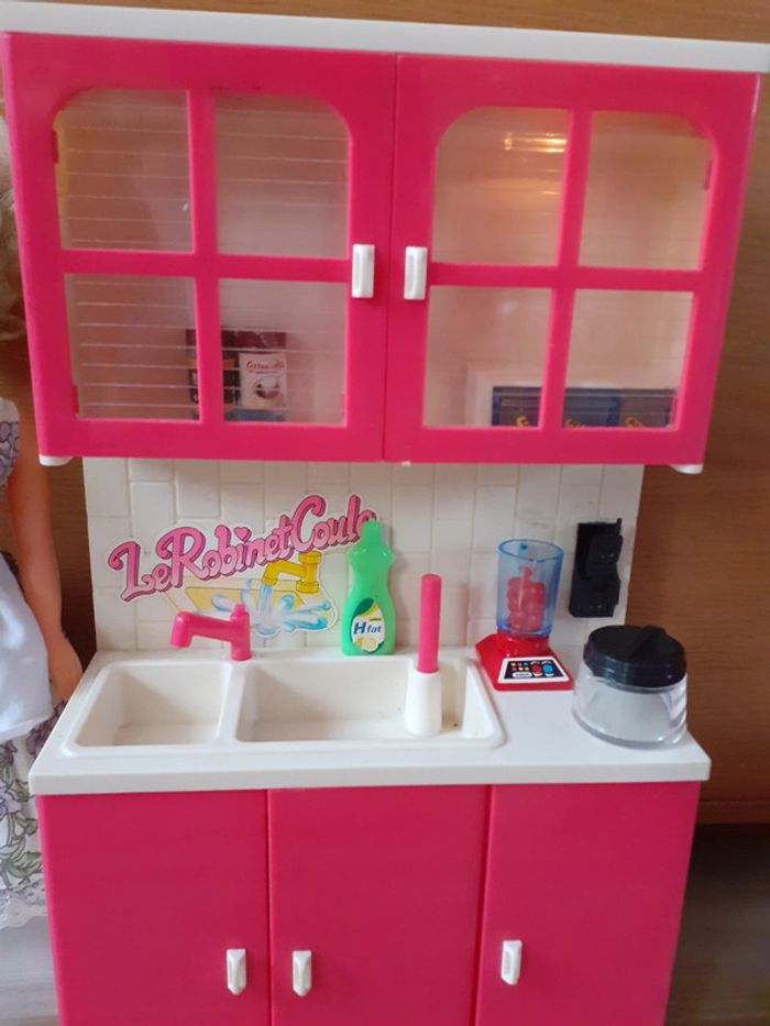 Barbie et sa cuisine équipée. Lumière dans le placard qui fonctionne grâce à une pile. (Photo n°3) Robinet qui coule lorsque l'on met de l'eau dans l evier et que l'on pompe grâce à la tige rose..(photo n°2) #Barbiespoupettes14