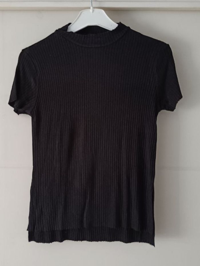 A vendre tee shirt noir côtelé T XS Manches courtes Grande fente sur le côté (photo 2) Hauteur totale 55 cm Largeur aisselles à aisselles 37 cm Très bon état car très peu porté