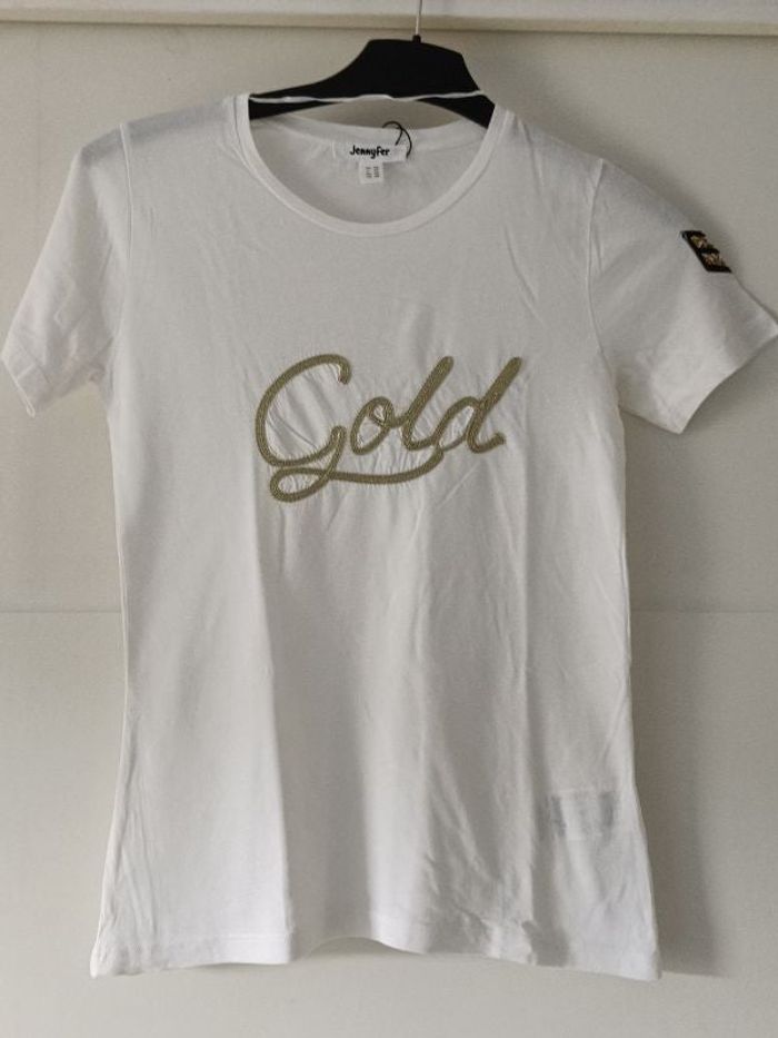 A vendre tee shirt blanc écru T XS Manches courtes "Gold" brodé en relief (photo 3) Écusson sur la manche (photo 4) Hauteur totale 60 cm Largeur aisselles à aisselles 39 cm 52% modal. 48% coton Très bon état car porté juste 1 fois
