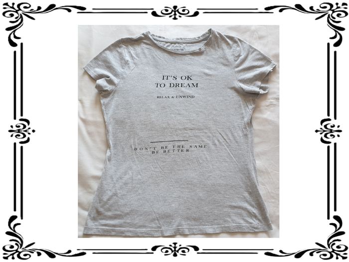 Tee shirt taille 38/40. Tee shirt gris avec écriture noires. Noté 42 mais taille petit. Tissu extensible sur 9 cm. Largeur d’épaule à épaule : 38 cm Largeur sous les bras : 47 cm Largeur à la taille : 42 cm Largeur en bas : 49,5 cm Hauteur du décolleté à partir des épaules: 6,5 cm Longueur totale : 58 cm Longueur des manches : 15 cm En très bon état. Primark. 3€. #vero38110vetementsfemme38