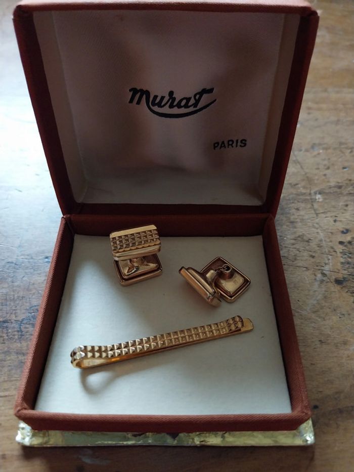 Boutons de manchettes extensible en plaqué or, Agrafe de cravate en plaqué or Nom et le poinçon de la marque, marque Murat. D'origine dans sa boite Seconde main, Dans son jus pour son époque, en générale bon état