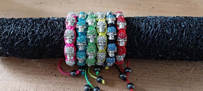 Lot de 6 Bracelets perles strass style Shamballa avec 7 motifs Tête de Mort et 4 perles d'hématite. comme neuf jamais porter.