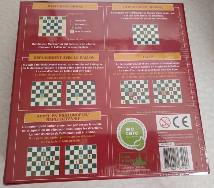 Neuf : Chessball, De la tête aux pieds (Echec et football) Par Aurélie et Toll-Ndjog Dibaya Age : 6 ans et plus Joueur : 2 joueurs Durée : 20 min Éditeur : Les pins de Colombes Dimensions boite : 25.8 x 25.8 x 6.4 cm Jeu Neuf sous blister Résumé Mélange d'échec et de football Jeux de réflexion et de stratégie sur un plateau damier 6x7. Chaque joueur possède une équipe composée de 2 attaquants et 3 défenseurs. Le but du jeu est de pousser le ballon sur la dernière ligne adverse. Améliore les capacités de : concentration, mémorisation et résolution de problèmes Améliore la concentration et la mémoire Chessball est un jeu abstrait qui fait travailler la mémoire visuelle, l'attention et la représentation dans l'espace. Améliore les compétences en Mathématiques Tout comme les échecs, Chessball permet aux enfants d'acquérir des compétences facilitant la résolution de problèmes complexes.