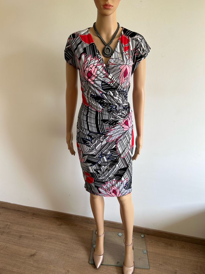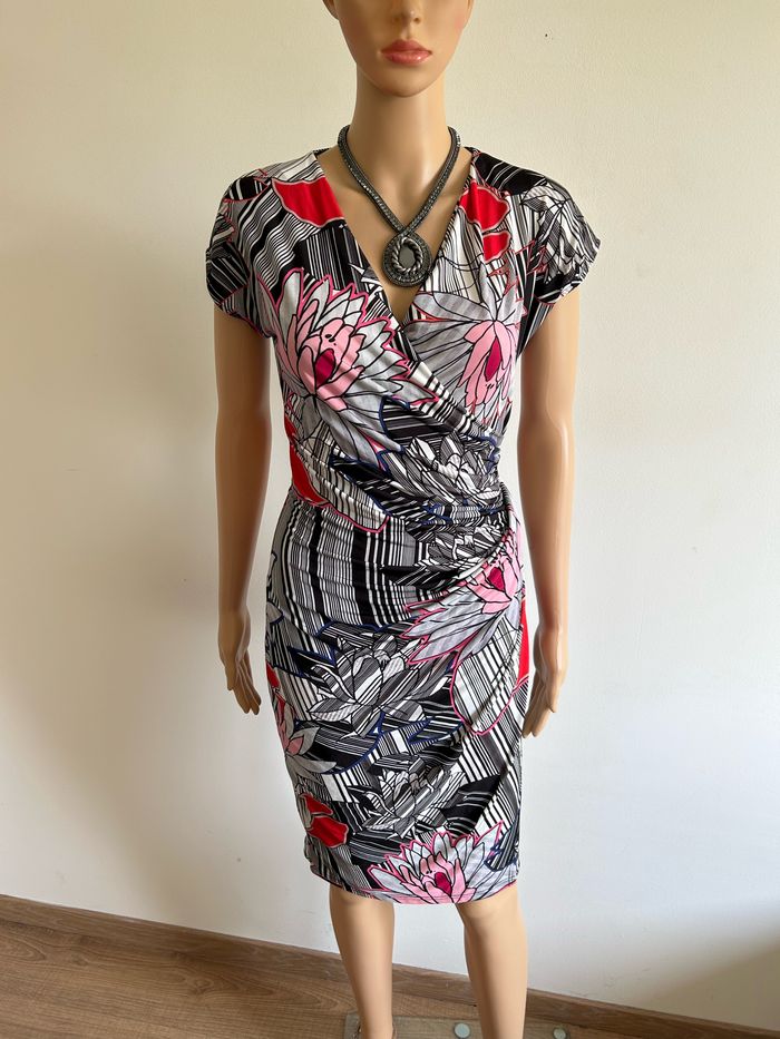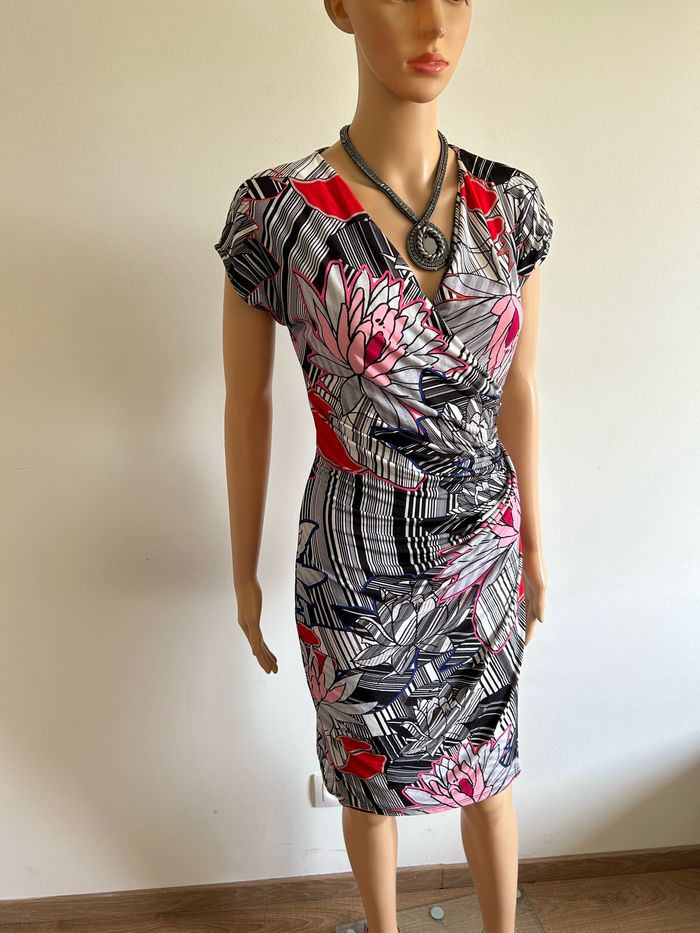Jolie robe imprimée à manches courtes, de marque Riu. Taille 38. Jamais portée, état neuf. aisselle à aisselle 37 cms à 47 cms taille 34 cms à 42 cms longueur depuis épaule 95 cms Le tissu est extensible 95% polyester et 5% elasthanne
