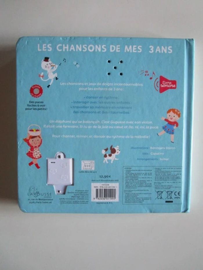 > Un livre tout-carton, 5 jolies comptines parmi les plus populaires : C'est Gugusse avec son violon; Do, ré, mi... la puce; Il était une fermière; Si tu as de la joie au coeur ; > Un enregistrement de qualité > Un temps d'écoute généreux (120 secondes) > De belles images à regarder Éditeur ‏ : ‎ Larousse 10 pages Âge de lecture ‏ : ‎ Dès 3 ans Dimensions ‏ : ‎ 20 x 1.5 x 20 cm Livre en très bon état (légères marques sur le bord de couverture, piles neuves, bouton on/off) Je vends d'autres livres sonores #phil_peg_livresonore ou sur Noël #phil_peg_noel #livresonore #chansons #comptines #gugusse #maternelle