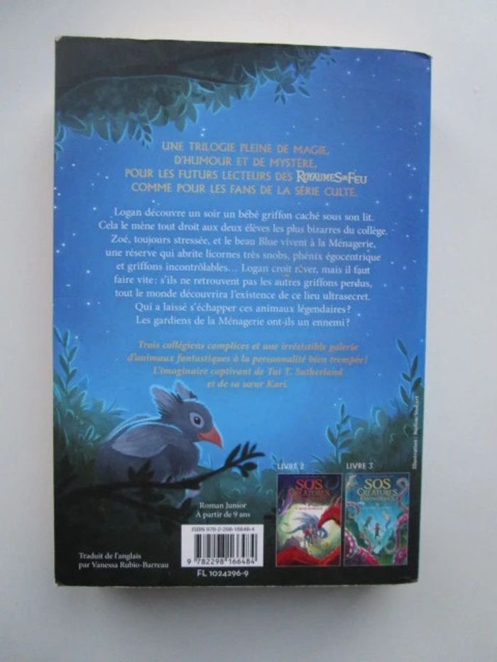 Stupéfait d'avoir trouvé un bébé griffon sous son lit, Logan découvre qu'il appartient aux deux élèves les plus bizarres du collège, Zoé et Blue. Ils vivent à la Ménagerie, une réserve qui abrite des licornes très snobs, un phénix égocentrique et des griffons incontrôlables... Logan croit rêver, mais il faut faire vite : s'ils ne retrouvent pas les autres griffons perdus, ce lieu ultrasecret sera connu de tous. Qui a laissé s'échapper ces animaux fantastiques ? Les gardiens de la Ménagerie ont-ils un ennemi ? Éditeur ‏ : ‎ Gallimard Jeunesse Broché ‏ : ‎ 352 pages Âge de lecture ‏ : ‎ 9 - 12 ans Dimensions ‏ : ‎ 13.8 x 2.7 x 20.4 cm Livre comme neuf #créaturesfantastiques